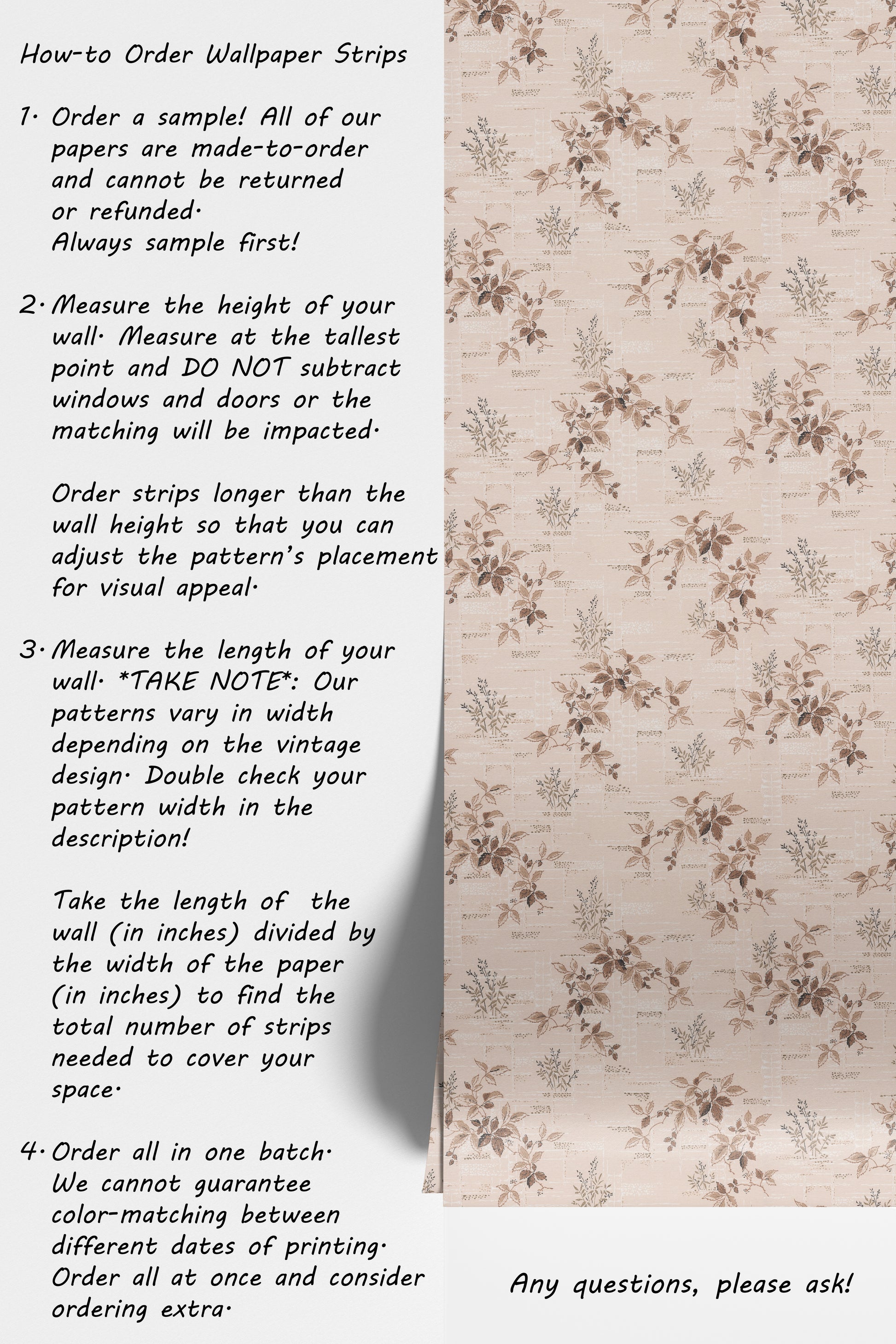 - Order a sample -- all of our wallpaper reproduction are made-to-order and cannot be returned or refunded. Always sample first!