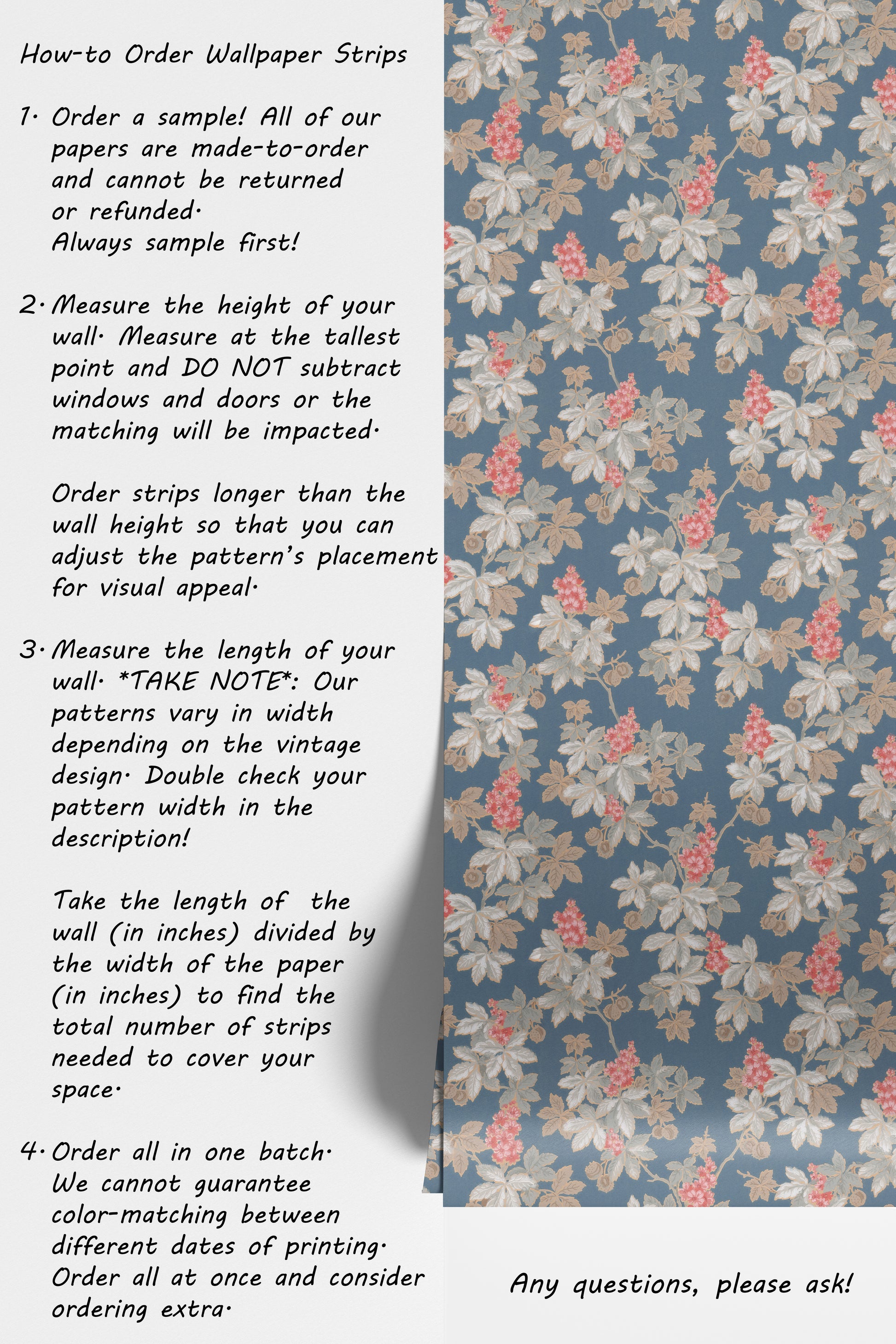 - Order a sample -- all of our wallpaper reproduction are made-to-order and cannot be returned or refunded. Always sample first!