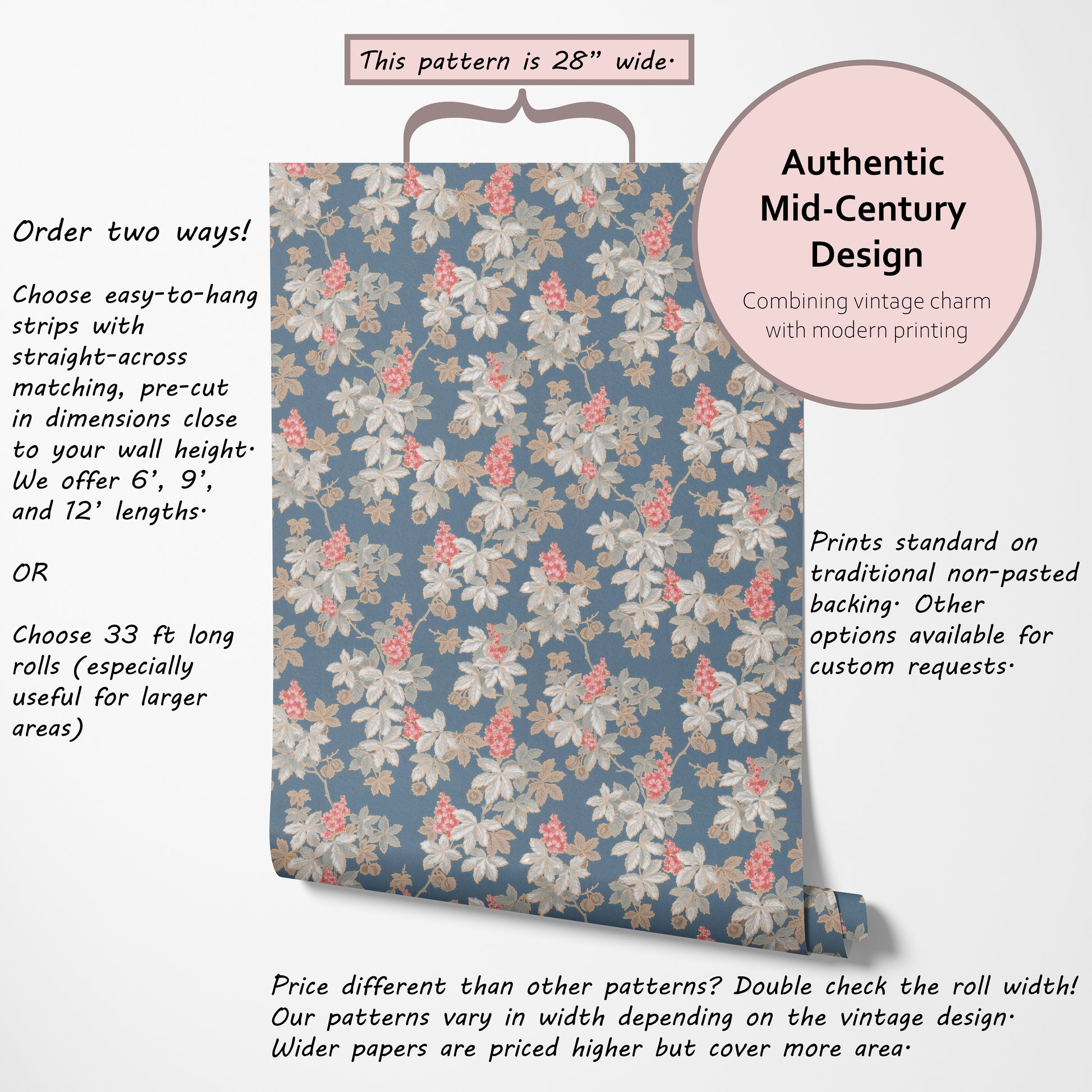 Our vintage wallpaper reproductions are printed to order and non-returnable.