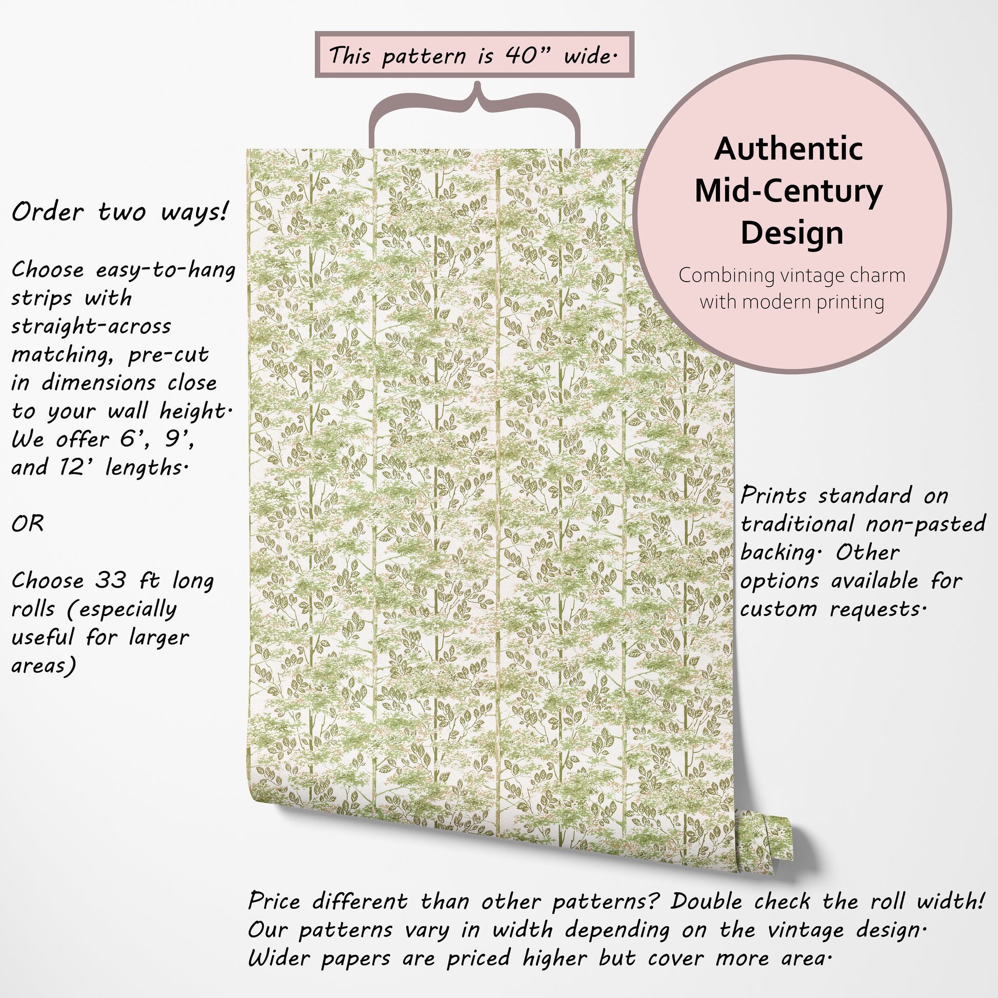 Our vintage wallpaper reproductions are printed to order and non-returnable.