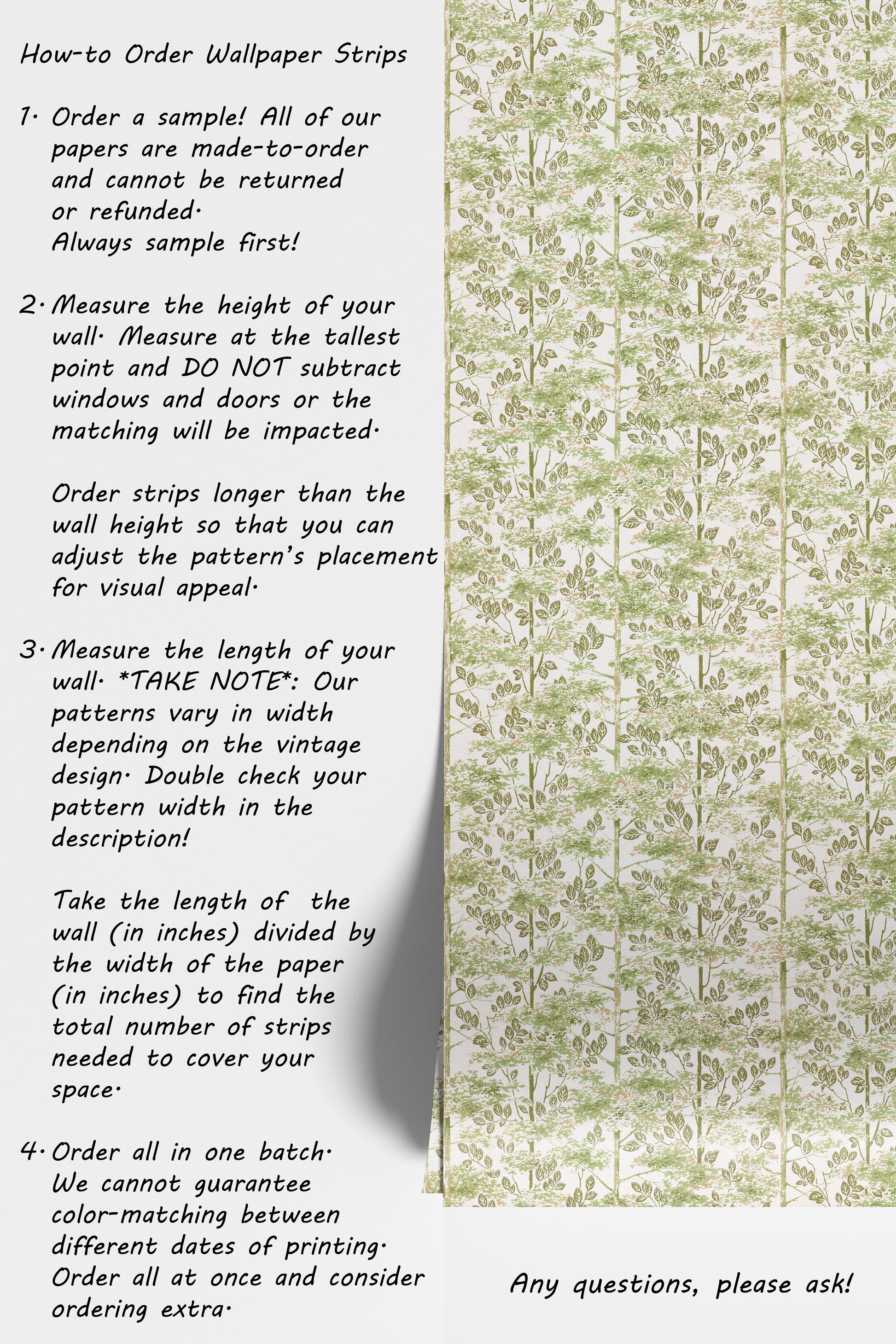 - Order a sample -- all of our wallpaper reproduction are made-to-order and cannot be returned or refunded. Always sample first!