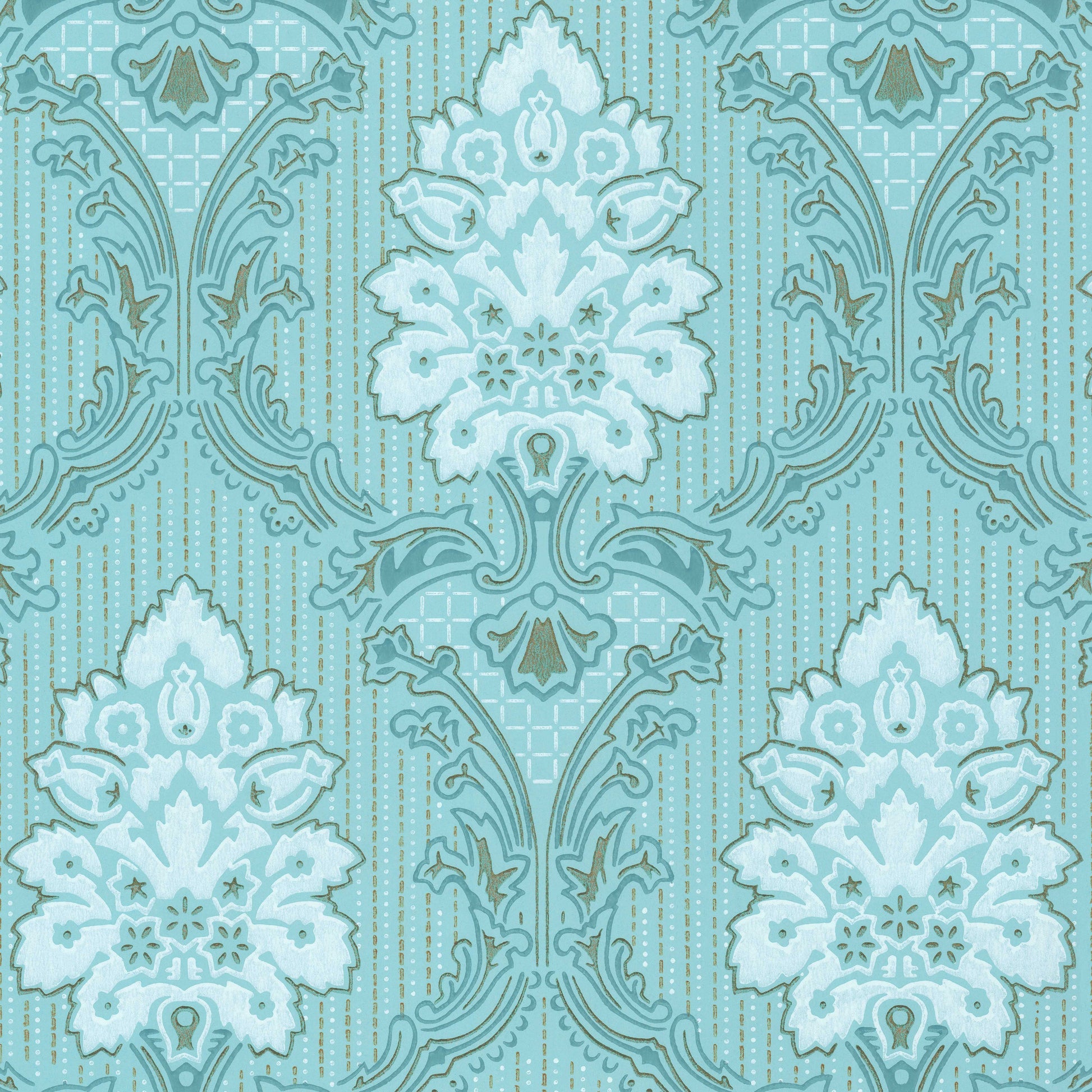 This wallpaper is a reproduction of an authentic 1940s damask design salvaged as part of the Hannah's Treasures Vintage Wallpaper collection.
