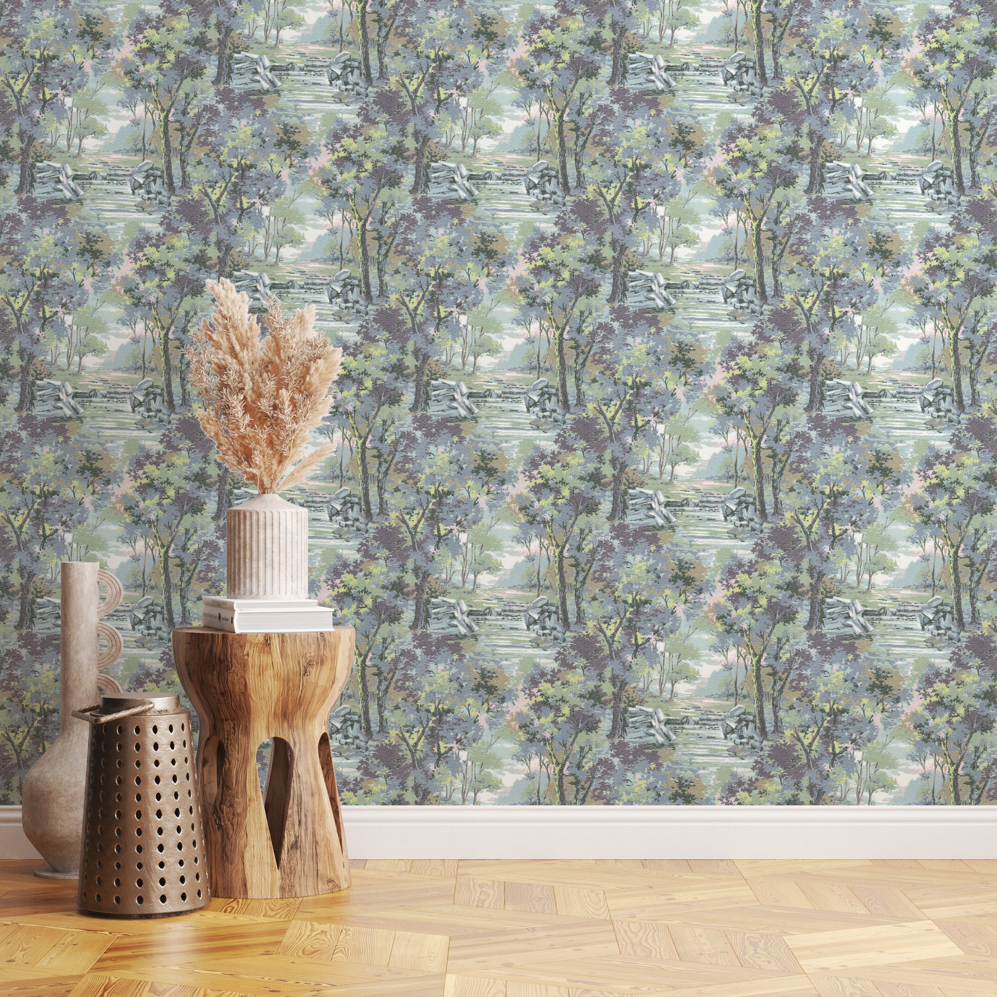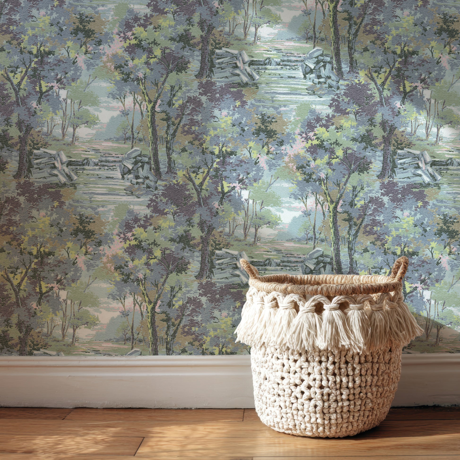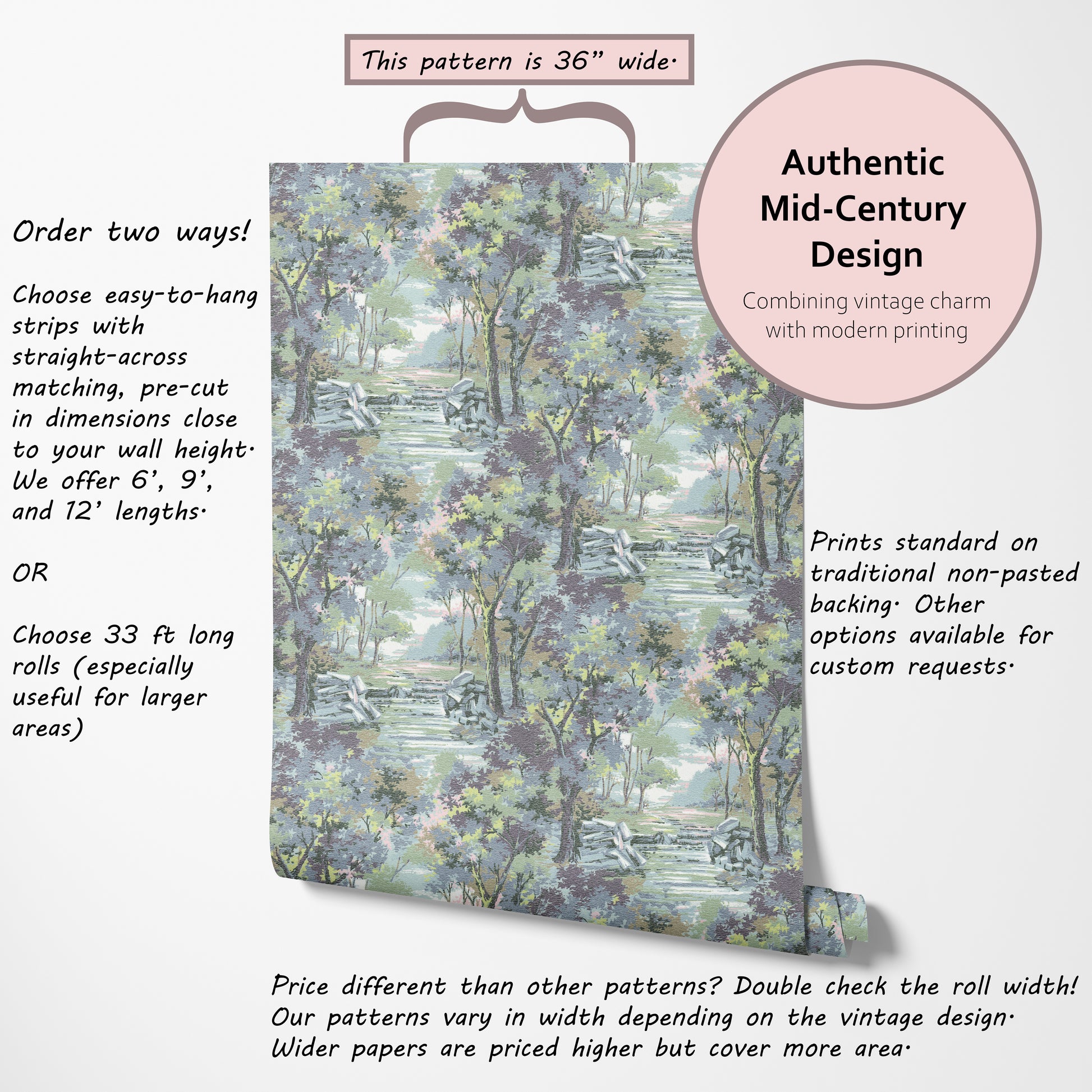 This wallpaper is a reproduction of an authentic 1950s scenic design salvaged as part of the Hannah's Treasures Vintage Wallpaper collection.
