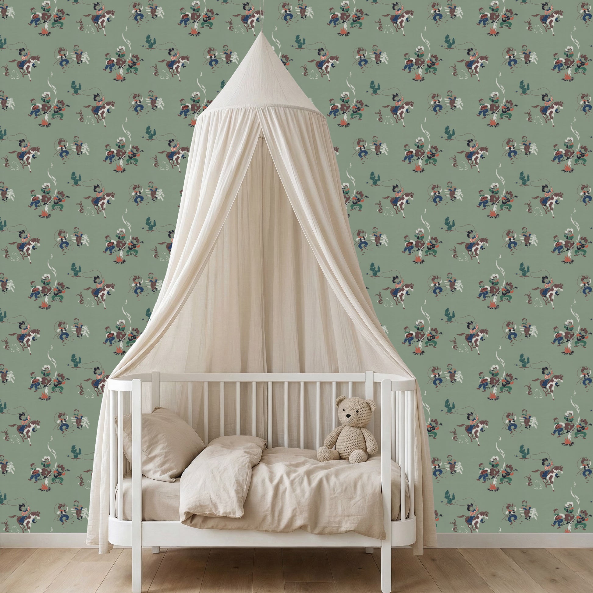 This wallpaper is a reproduction of an authentic 1940s cowboy design salvaged as part of the Hannah's Treasures Vintage Wallpaper collection.