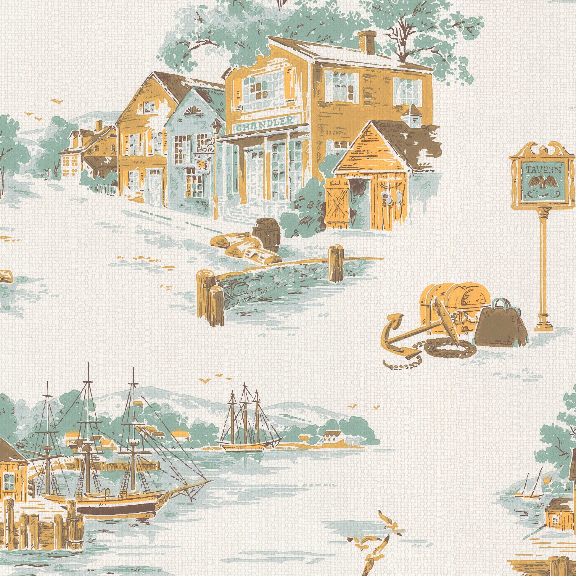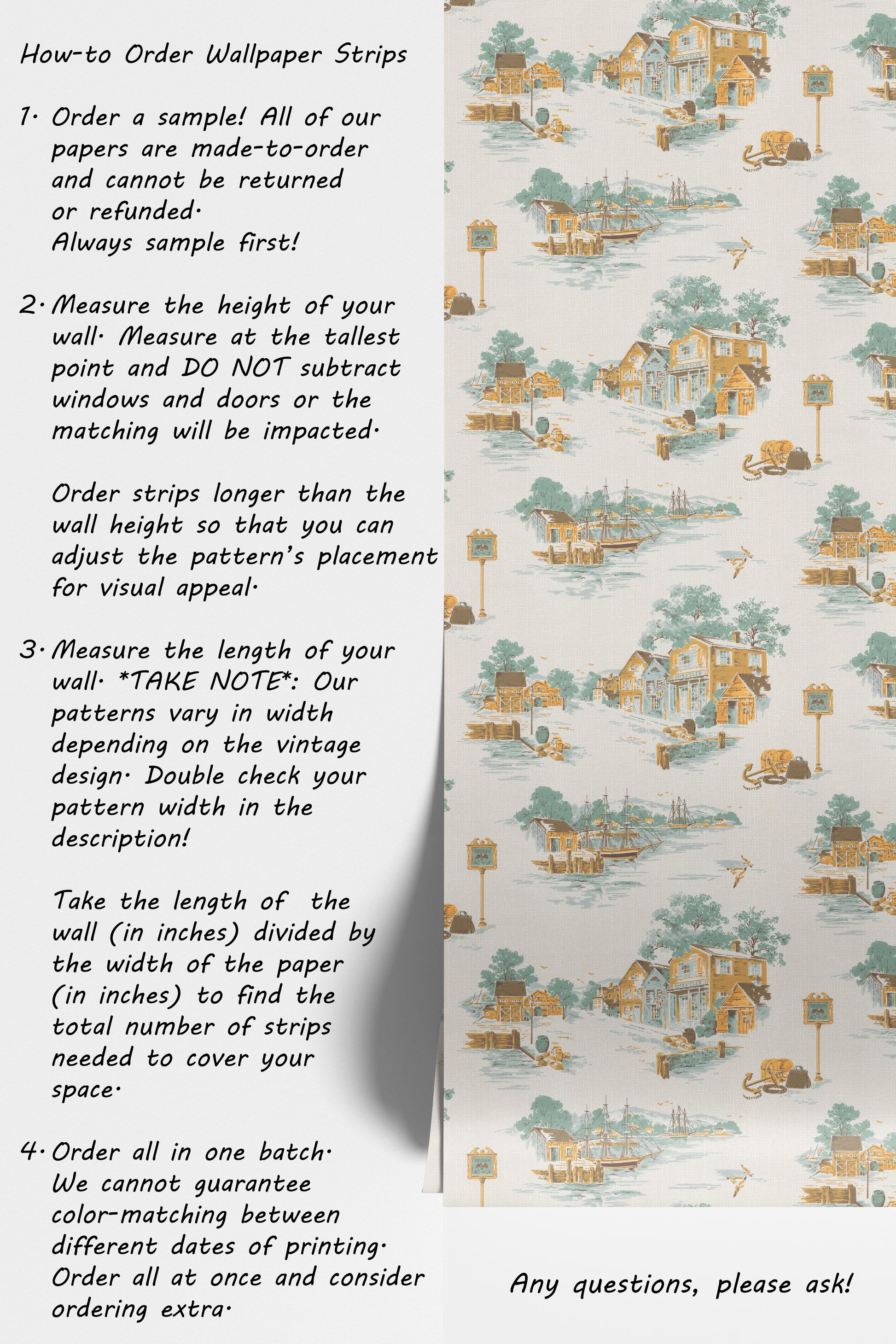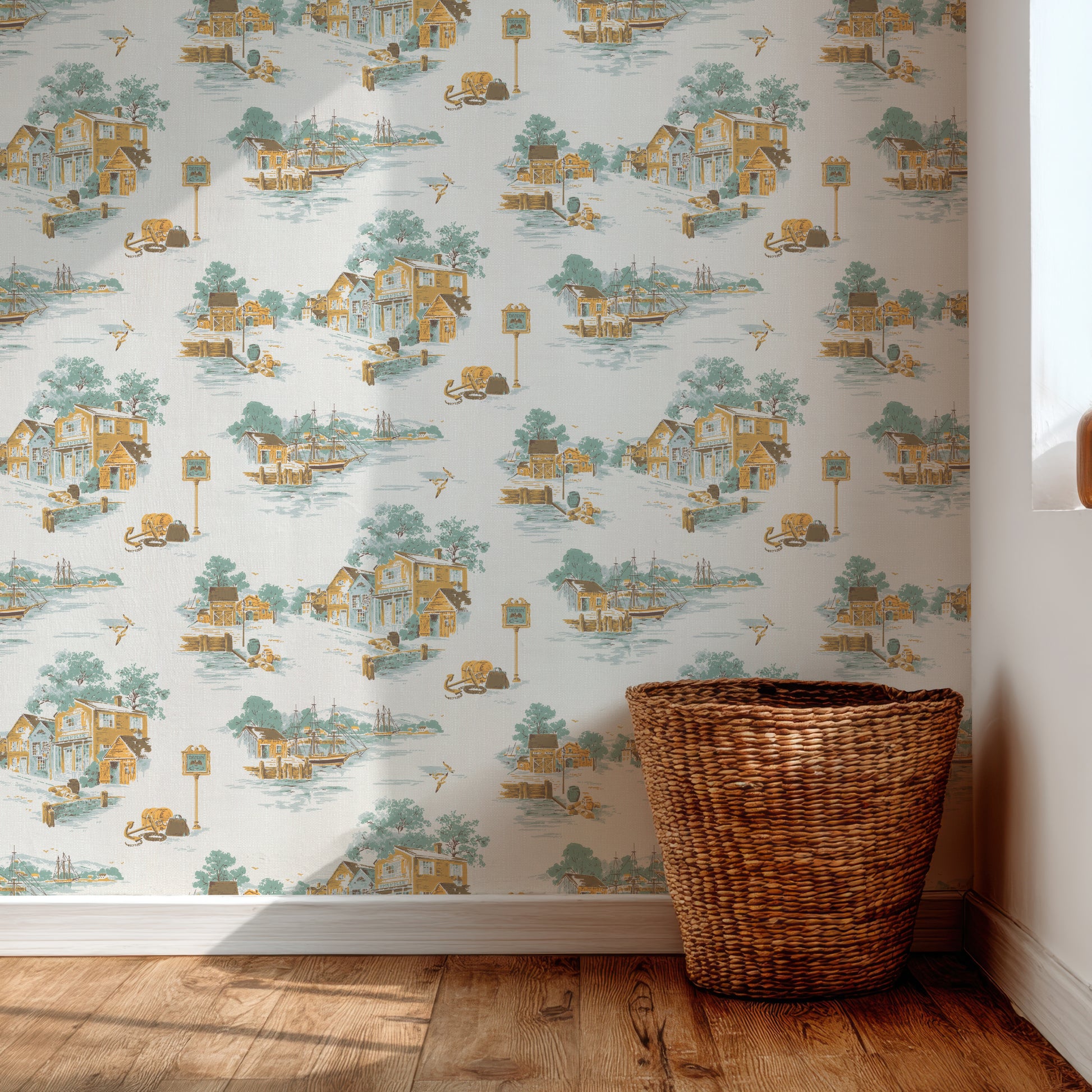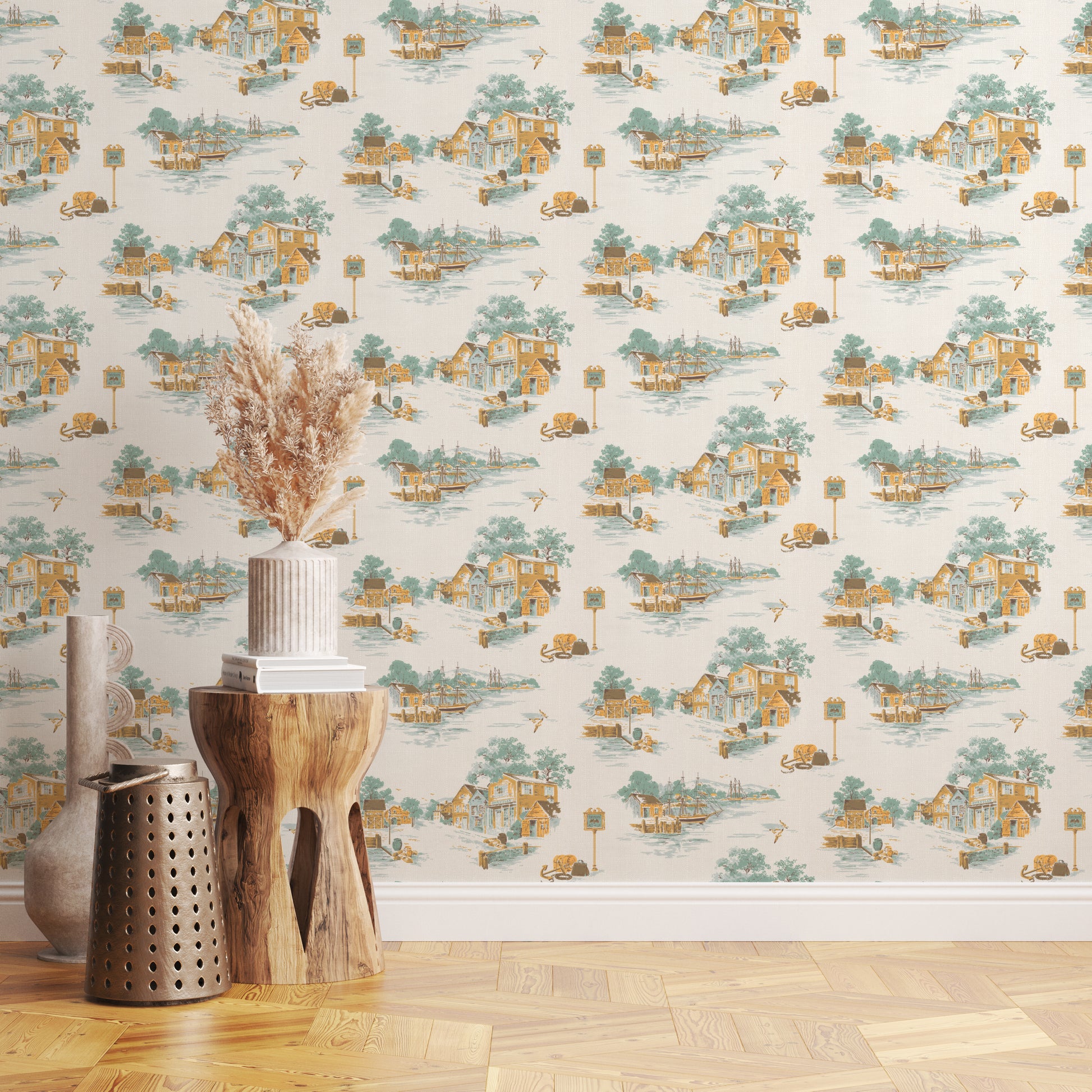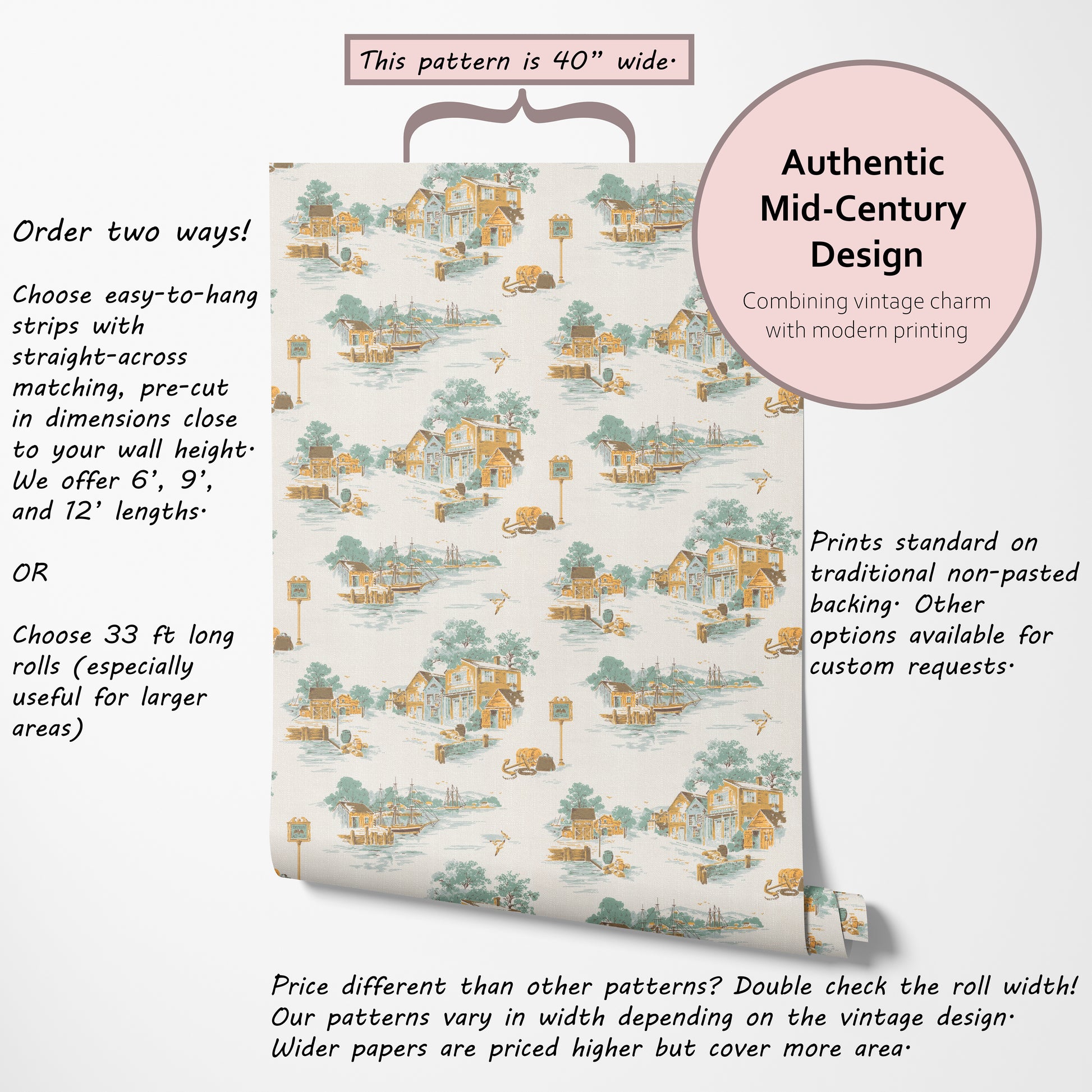 This wallpaper is a reproduction of an authentic 1960s scenic design salvaged as part of the Hannah's Treasures Vintage Wallpaper collection.