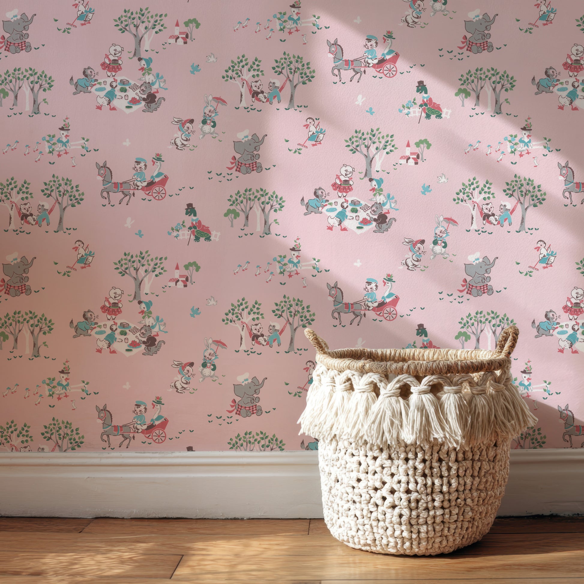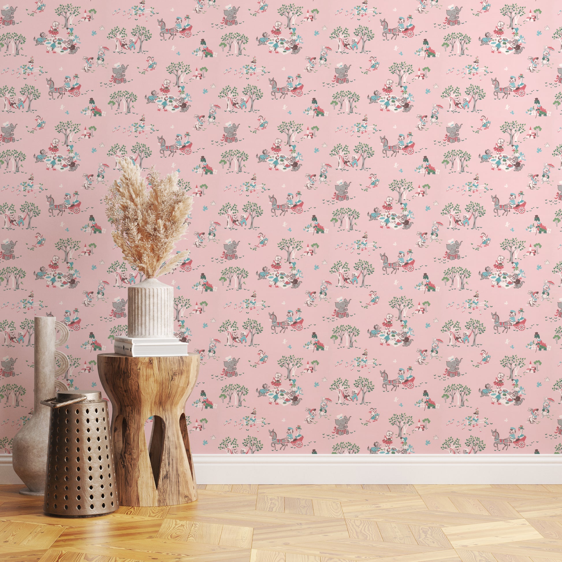 This wallpaper is a reproduction of an authentic 1950s children's design salvaged as part of the Hannah's Treasures Vintage Wallpaper collection.