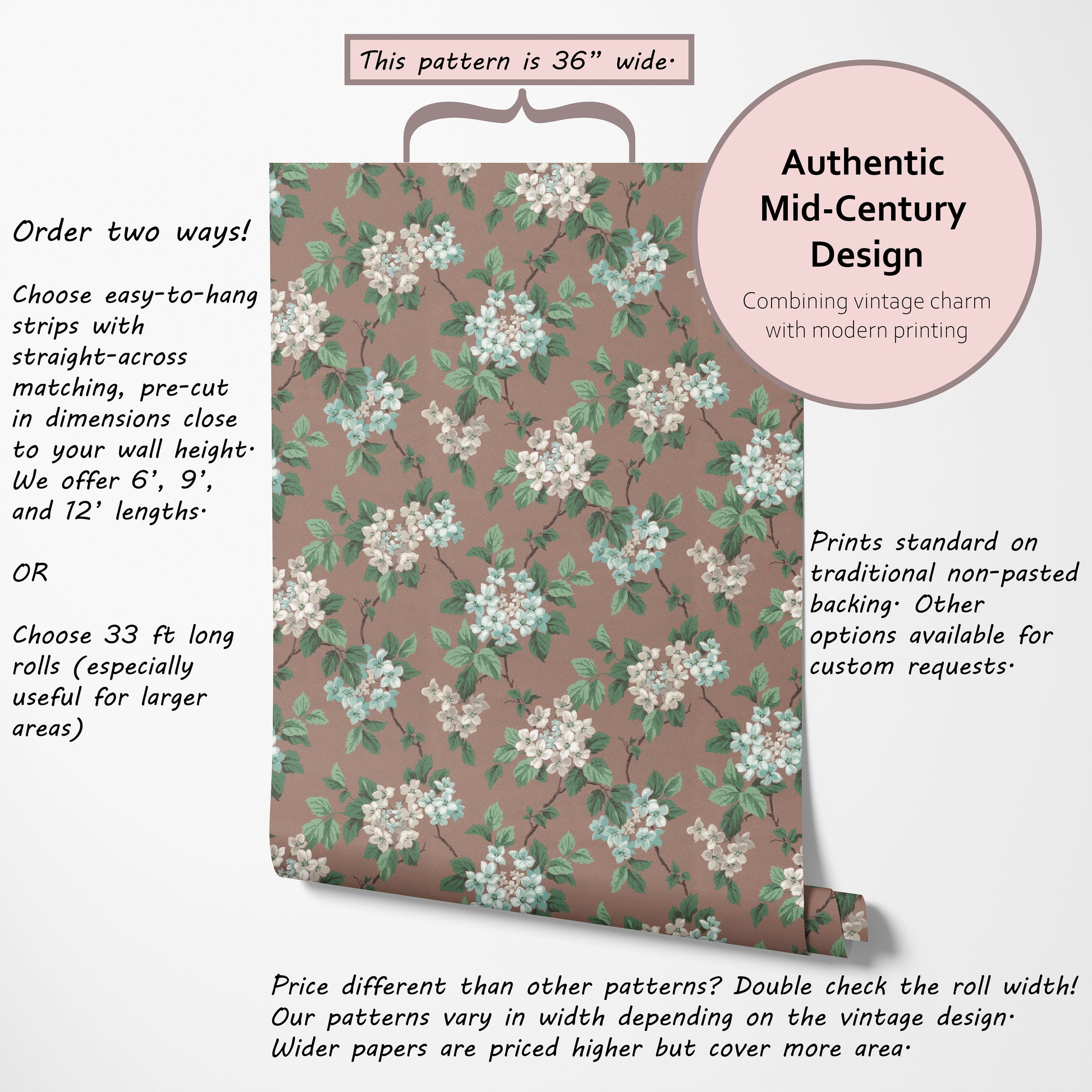 This wallpaper is a reproduction of an authentic 1950s floral design salvaged as part of the Hannah's Treasures Vintage Wallpaper collection.