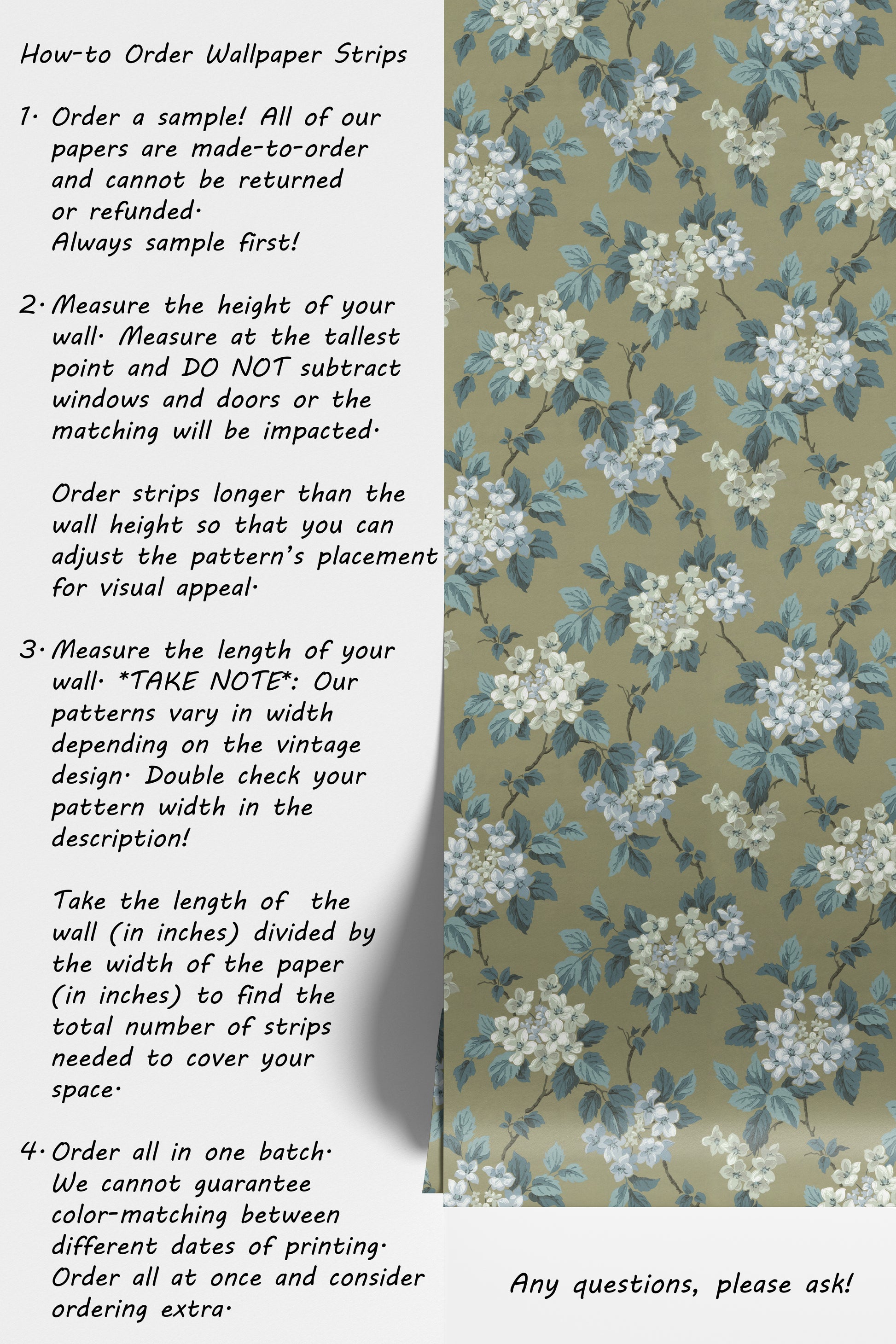 - Order a sample -- all of our wallpaper reproduction are made-to-order and cannot be returned or refunded. Always sample first!