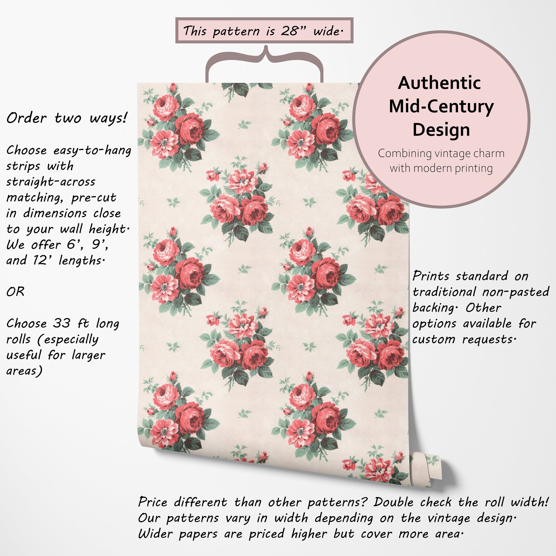This wallpaper is a reproduction of an authentic 1950s floral design salvaged as part of the Hannah's Treasures Vintage Wallpaper collection.