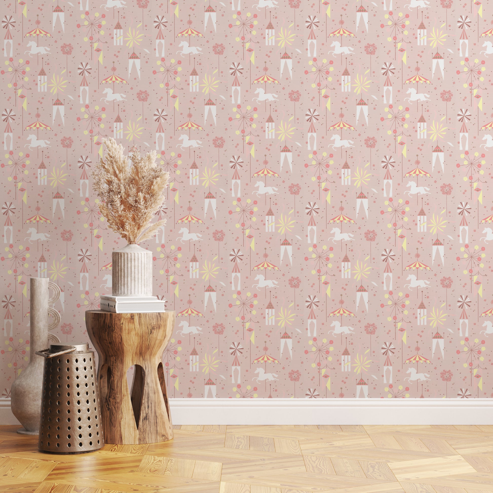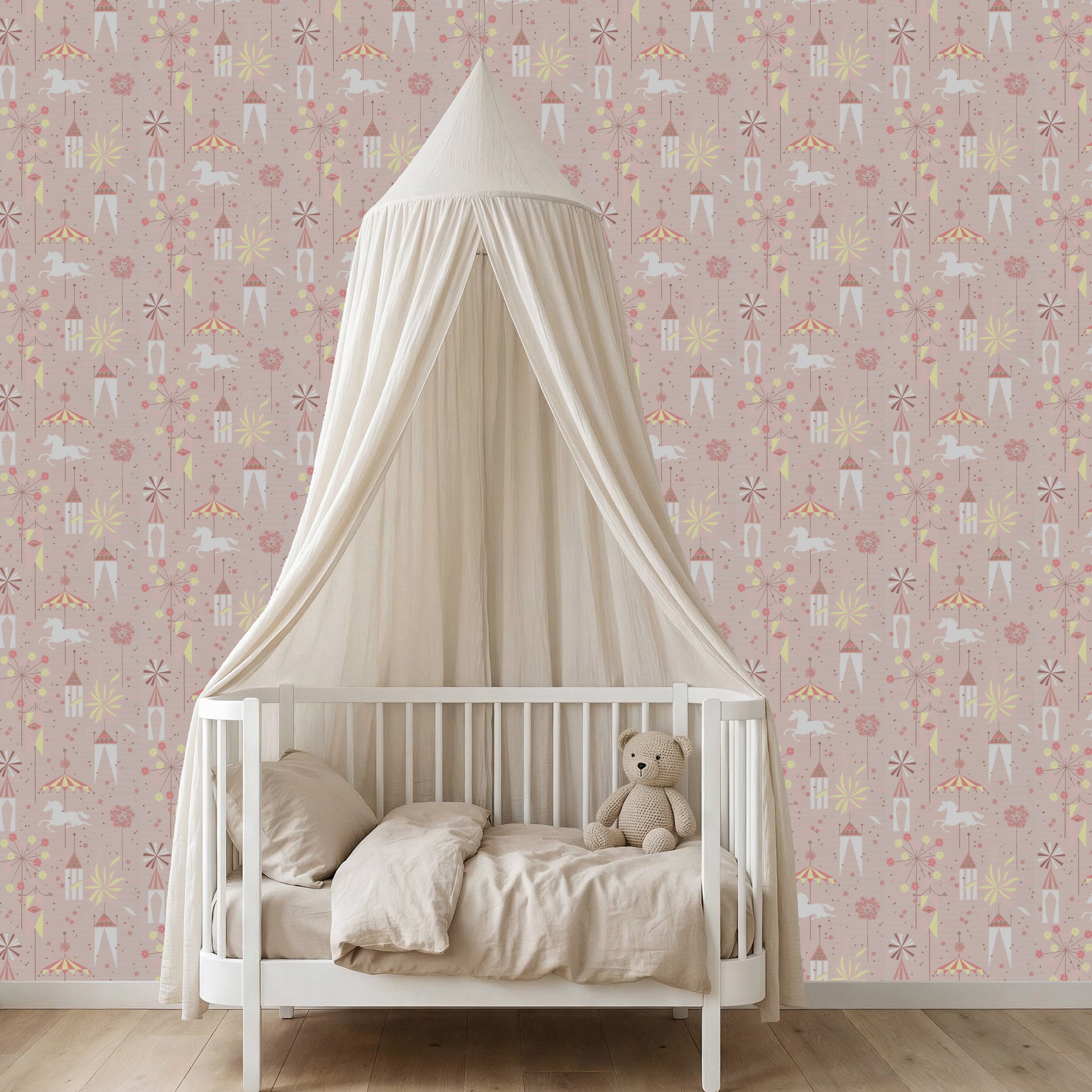 This wallpaper is a reproduction of an authentic 1950s children's design salvaged as part of the Hannah's Treasures Vintage Wallpaper collection.