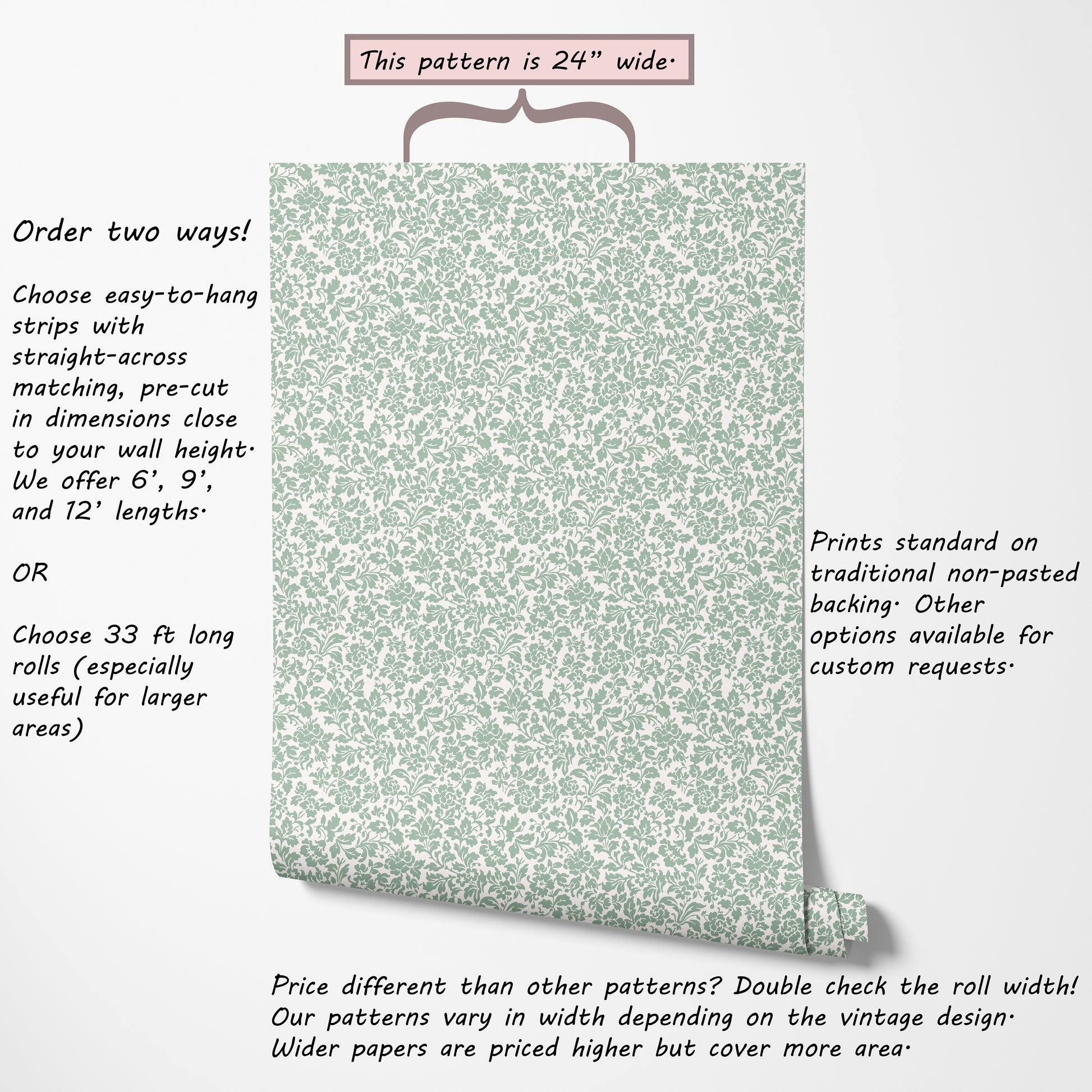 Purchase easy-to-hang pre-cut strips with seamless straight-across matching, available in 6ft, 9ft, and 12 ft lengths.