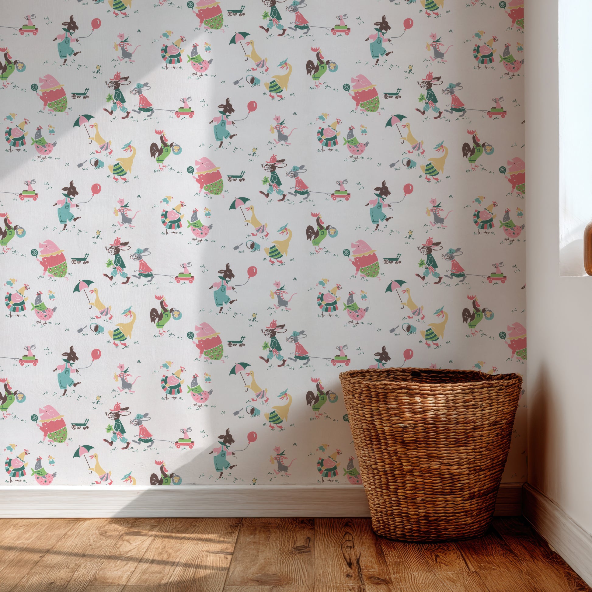 This wallpaper is a reproduction of an authentic 1950s children's design salvaged as part of the Hannah's Treasures Vintage Wallpaper collection.