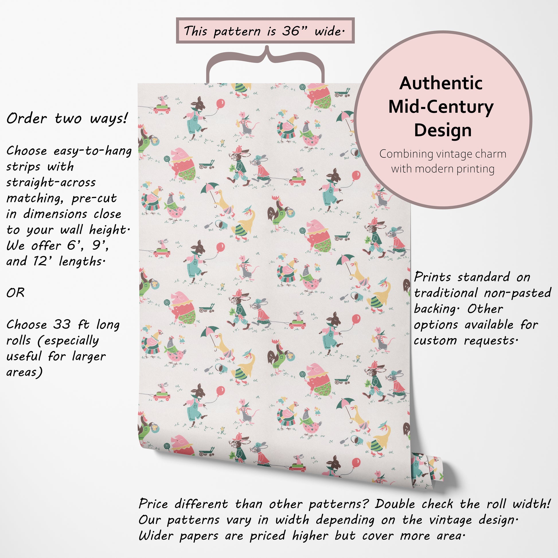 Our vintage wallpaper reproductions are printed to order and non-returnable.