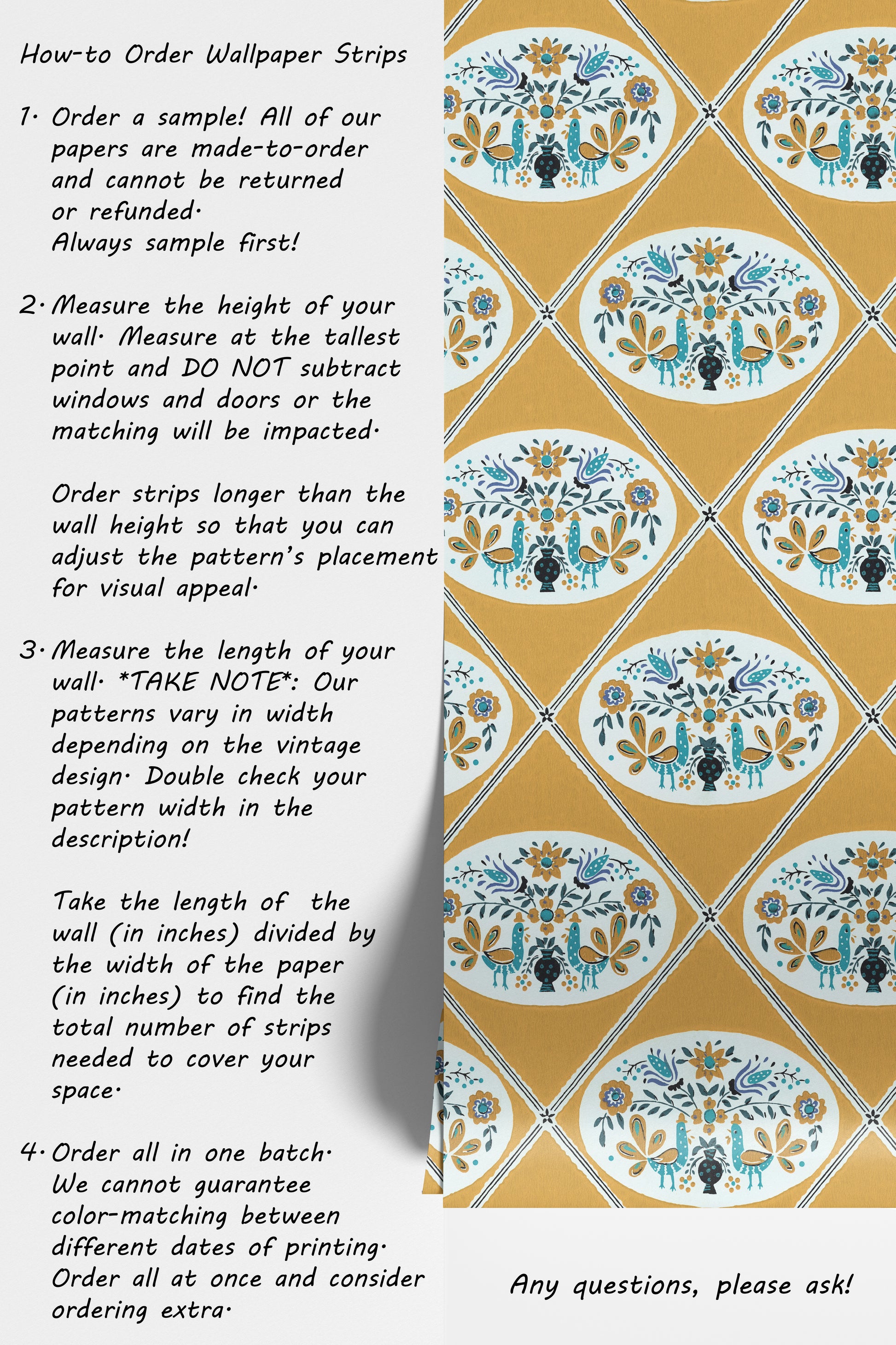 - Order a sample -- all of our wallpaper reproduction are made-to-order and cannot be returned or refunded. Always sample first!