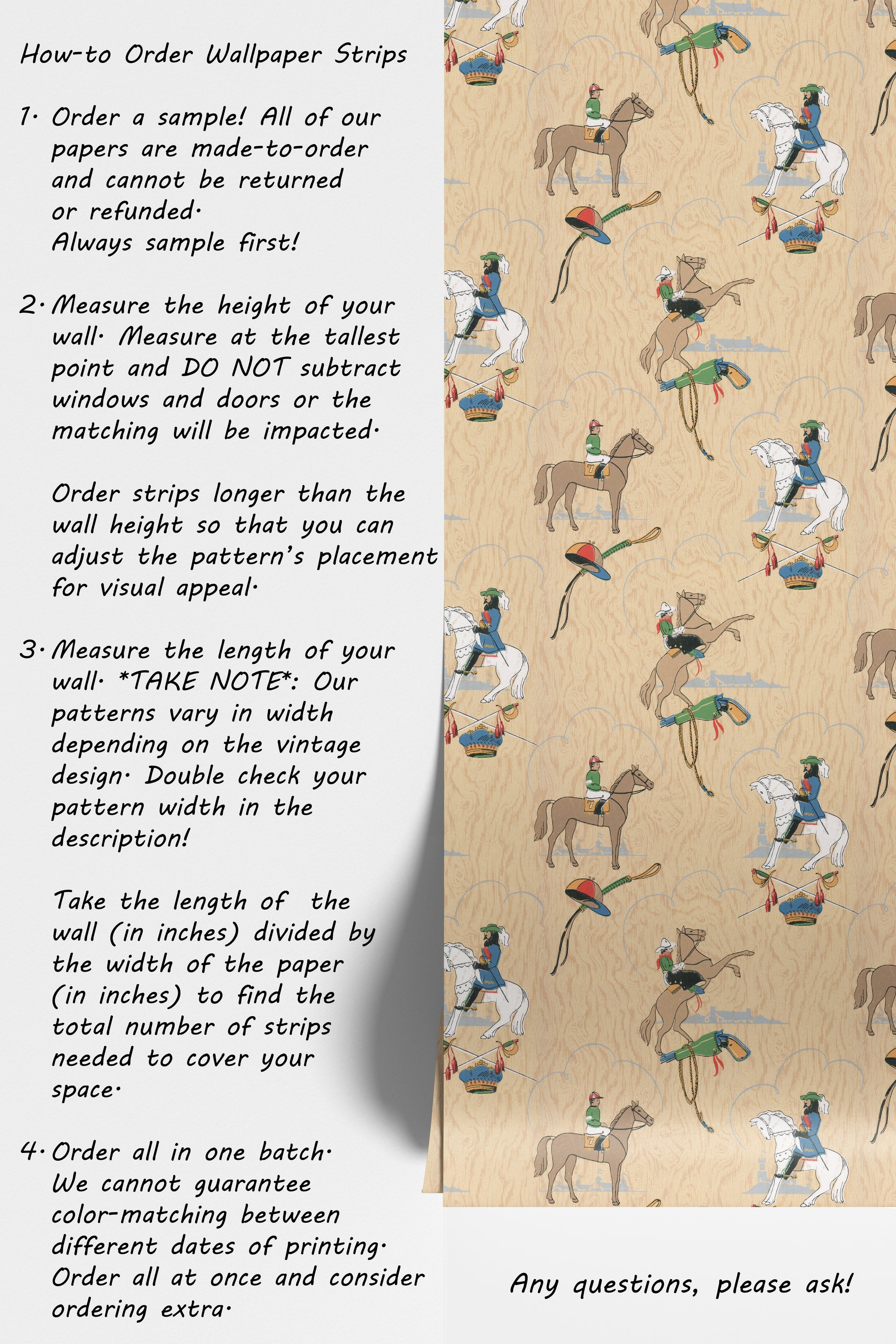 - Order a sample -- all of our wallpaper reproduction are made-to-order and cannot be returned or refunded. Always sample first!