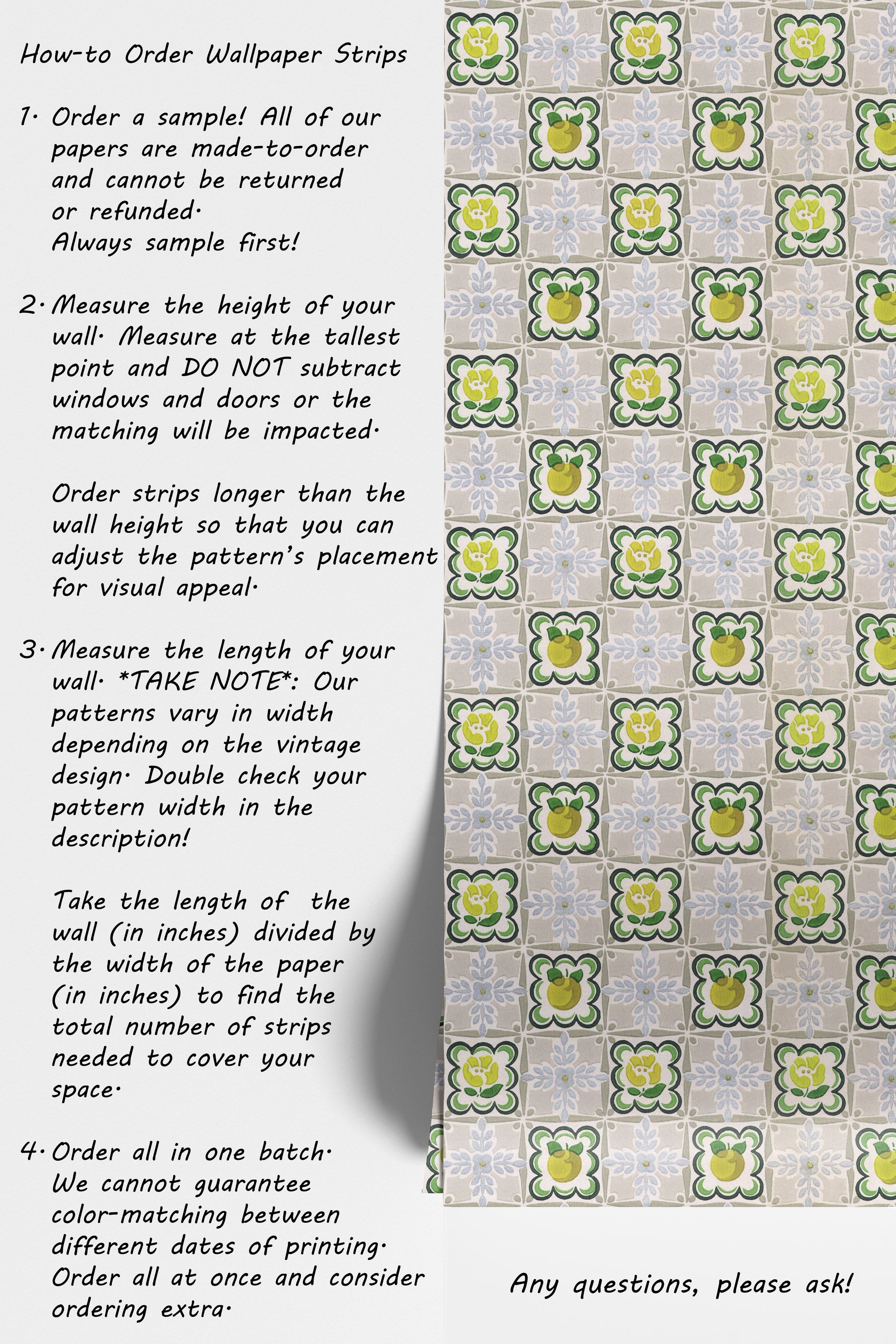 - Order a sample -- all of our wallpaper reproduction are made-to-order and cannot be returned or refunded. Always sample first!