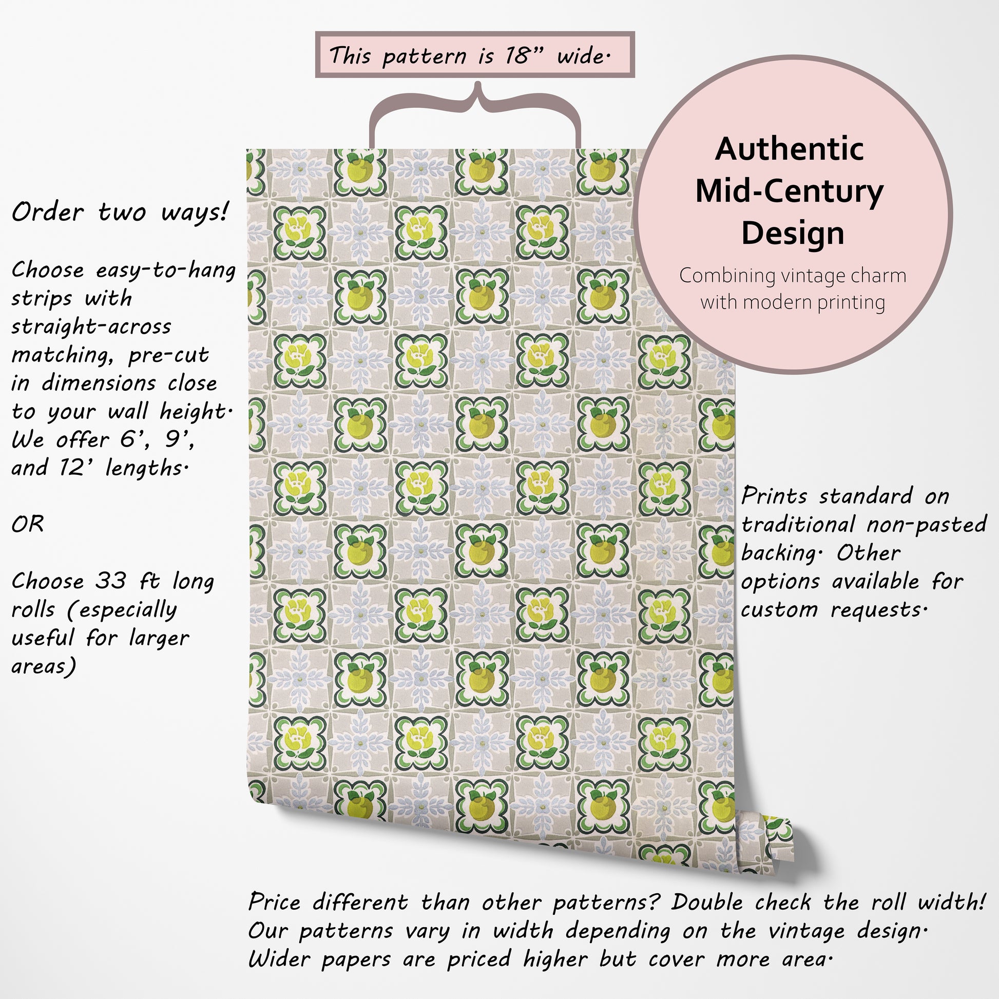 Our vintage wallpaper reproductions are printed to order and non-returnable.