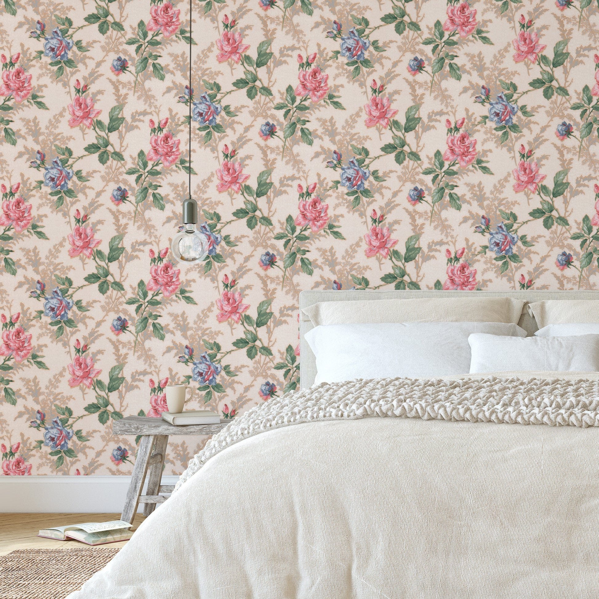This wallpaper is a reproduction of an authentic 1940s floral design salvaged as part of the Hannah's Treasures Vintage Wallpaper collection.