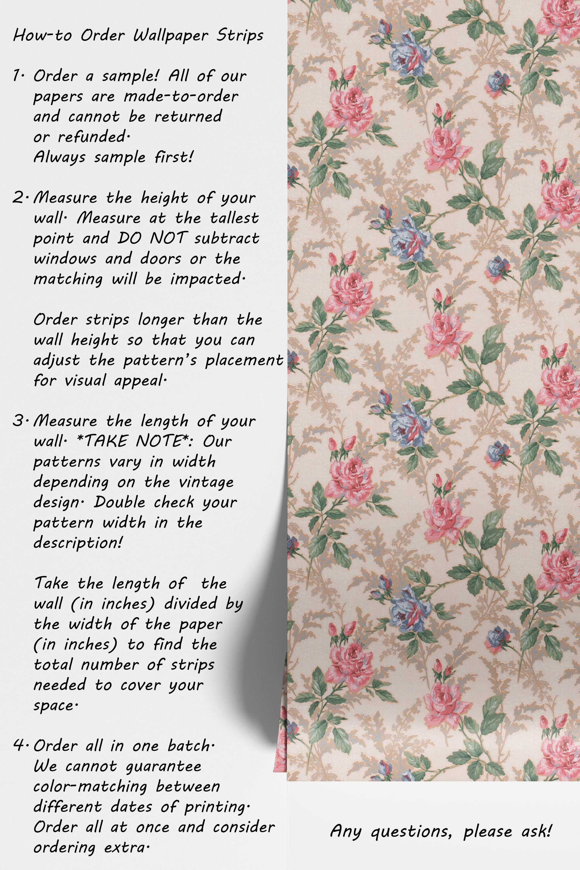 - Order a sample -- all of our wallpaper reproduction are made-to-order and cannot be returned or refunded. Always sample first!