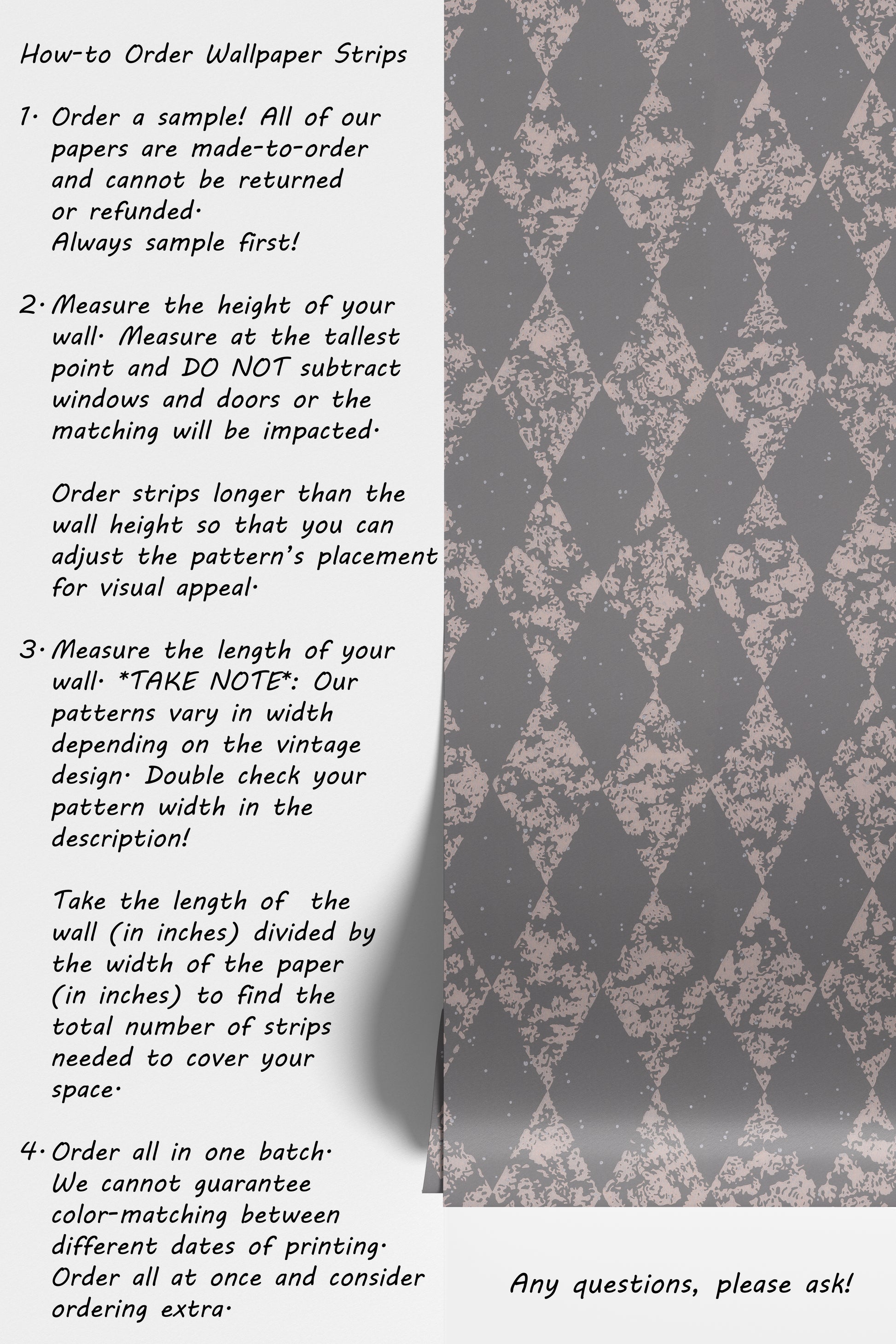 - Order a sample -- all of our wallpaper reproduction are made-to-order and cannot be returned or refunded. Always sample first!