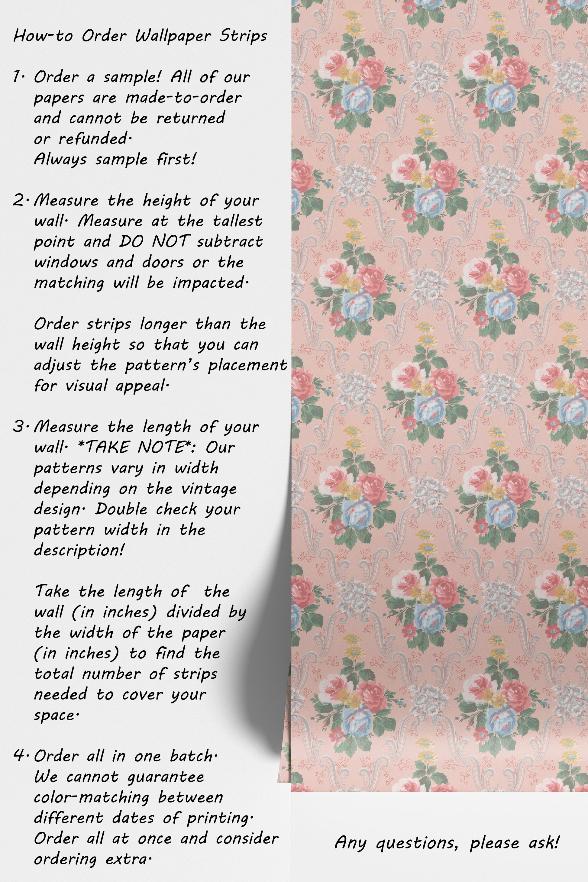 - Order a sample -- all of our wallpaper reproduction are made-to-order and cannot be returned or refunded. Always sample first!