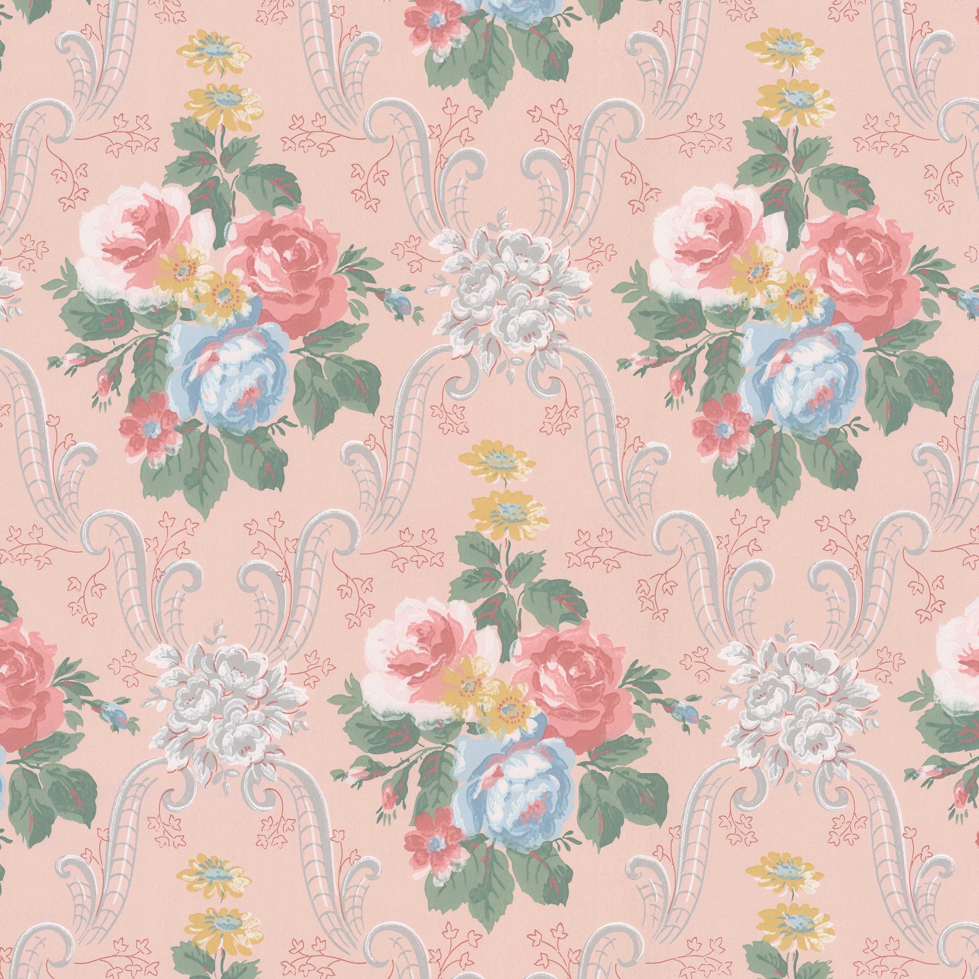 This wallpaper is a reproduction of an authentic 1950s floral design salvaged as part of the Hannah's Treasures Vintage Wallpaper collection.