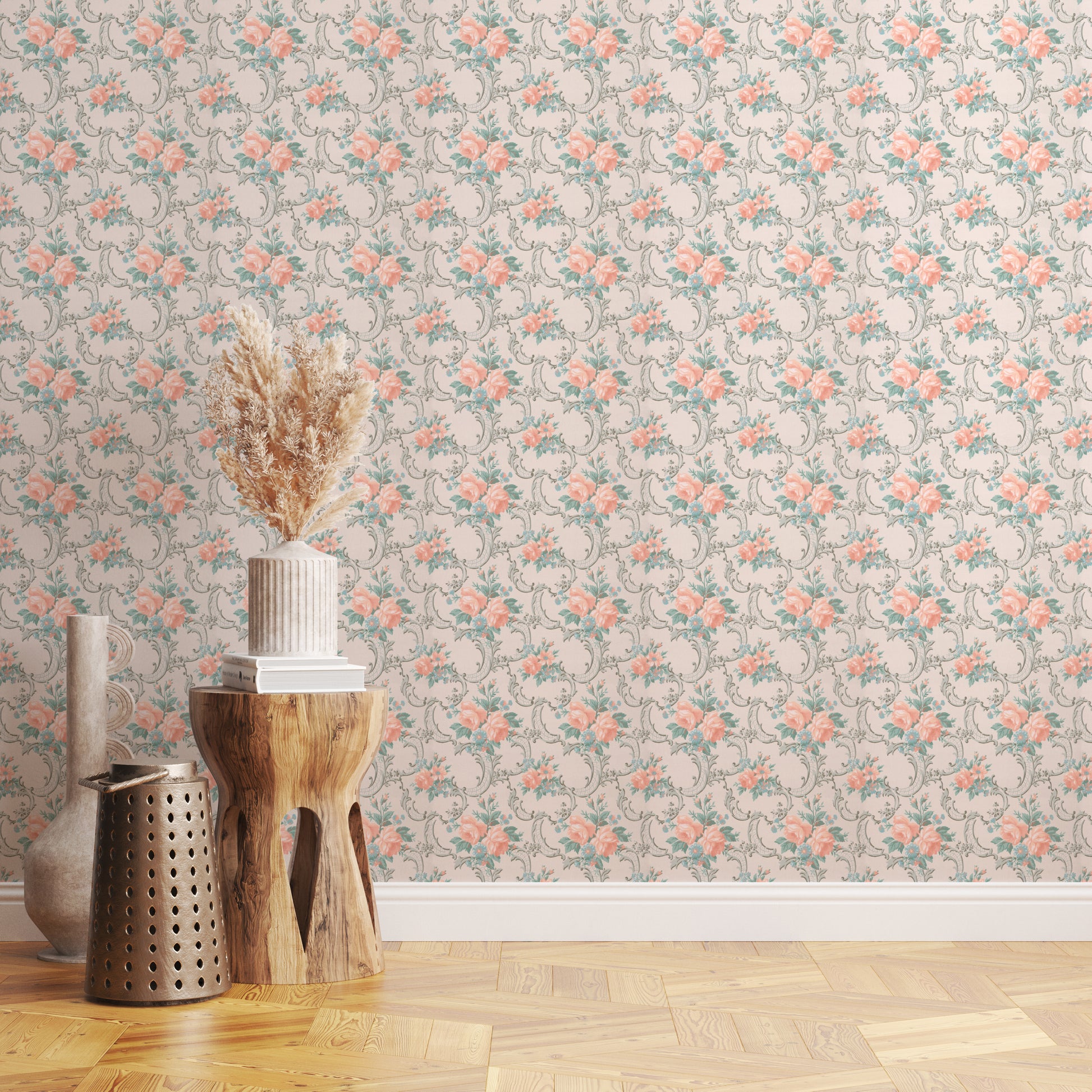 This wallpaper is a reproduction of an authentic 1940s floral design salvaged as part of the Hannah's Treasures Vintage Wallpaper collection.
