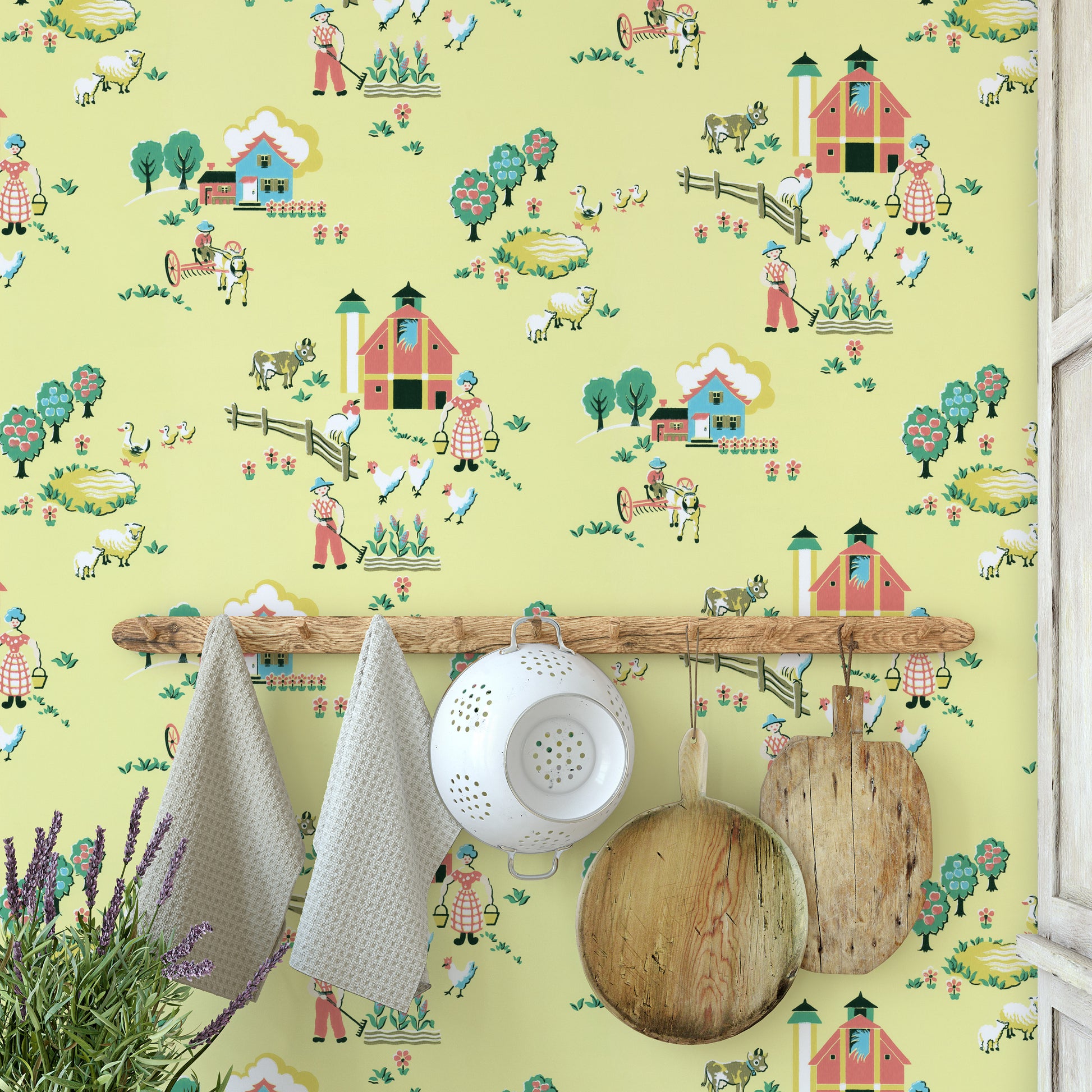 This wallpaper is a reproduction of an authentic 1950s kitchen design salvaged as part of the Hannah's Treasures Vintage Wallpaper collection.