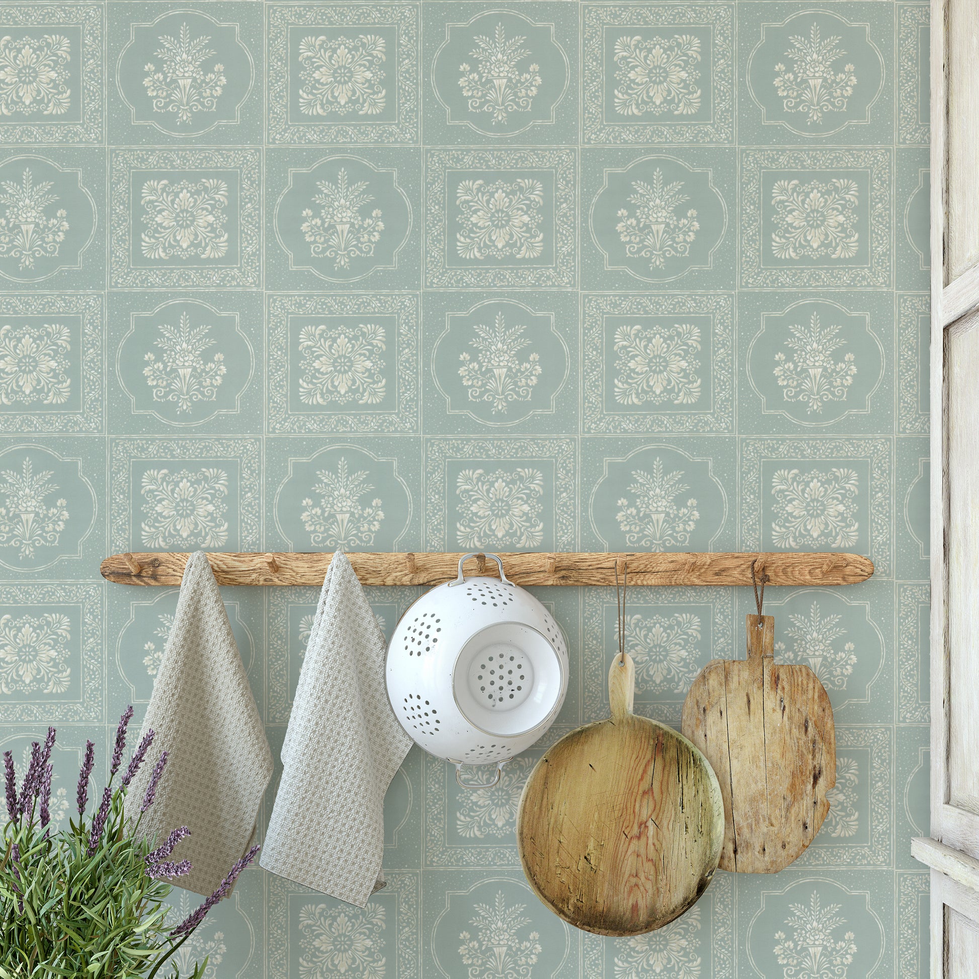 This wallpaper is a reproduction of an authentic 1950s floral tile design salvaged as part of the Hannah's Treasures Vintage Wallpaper collection.