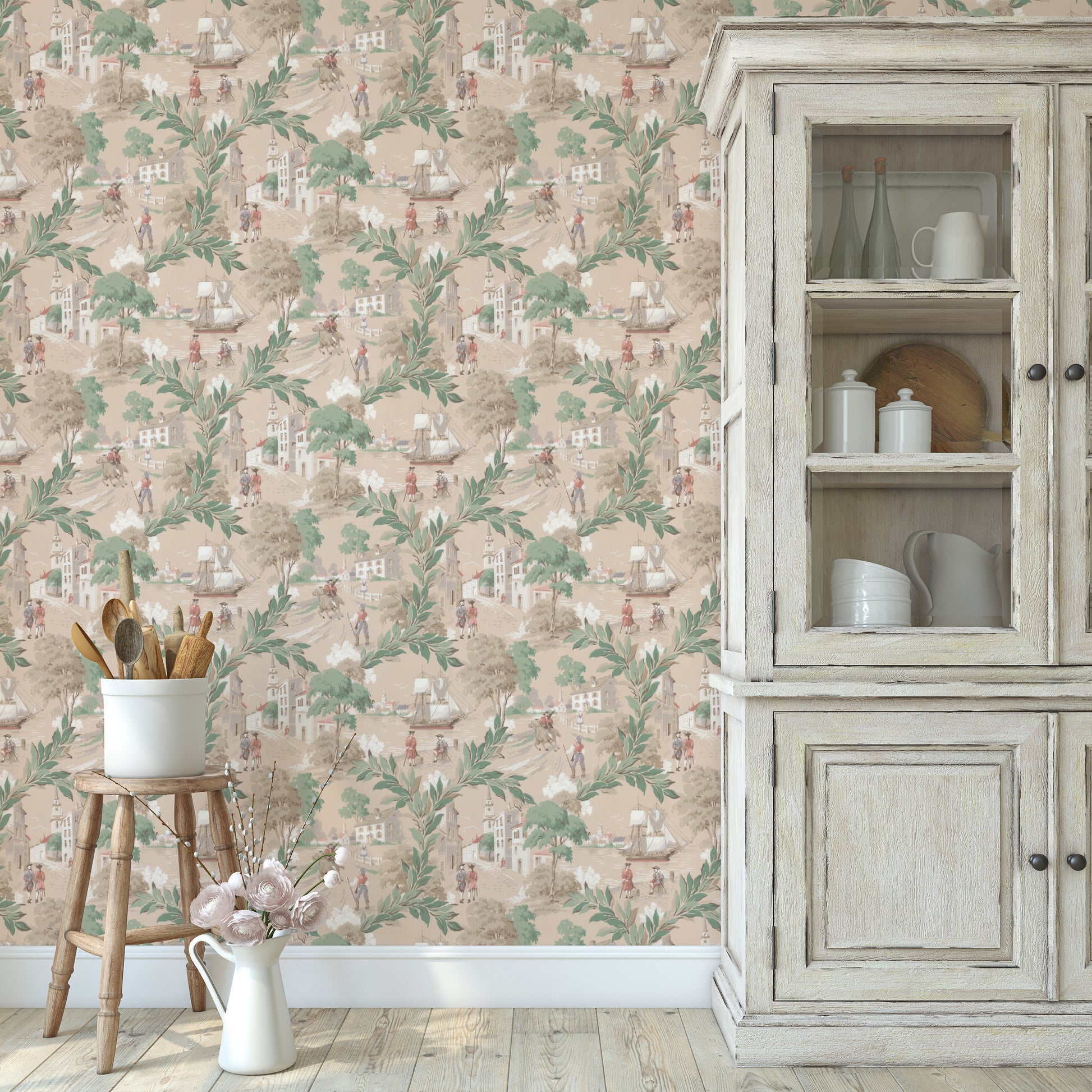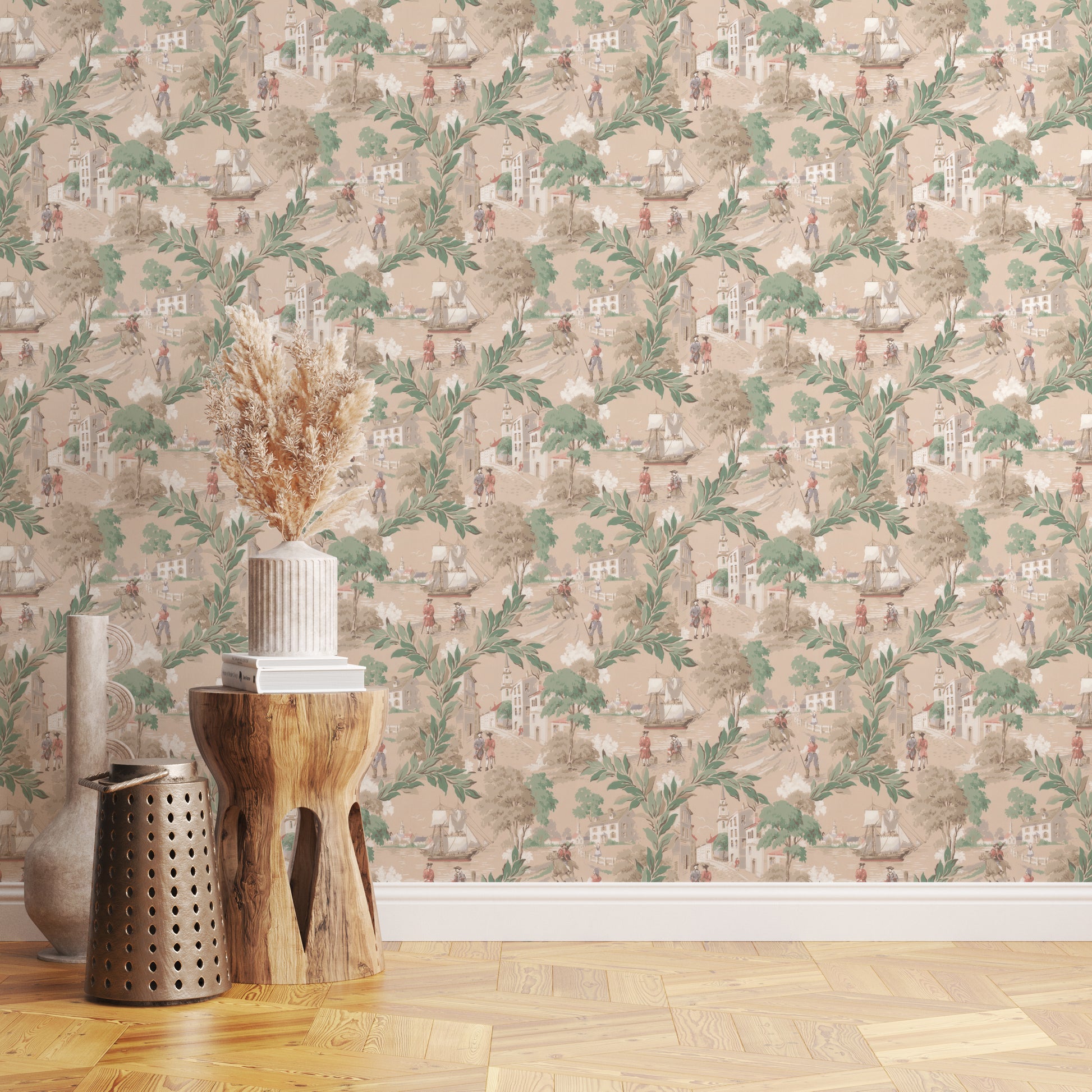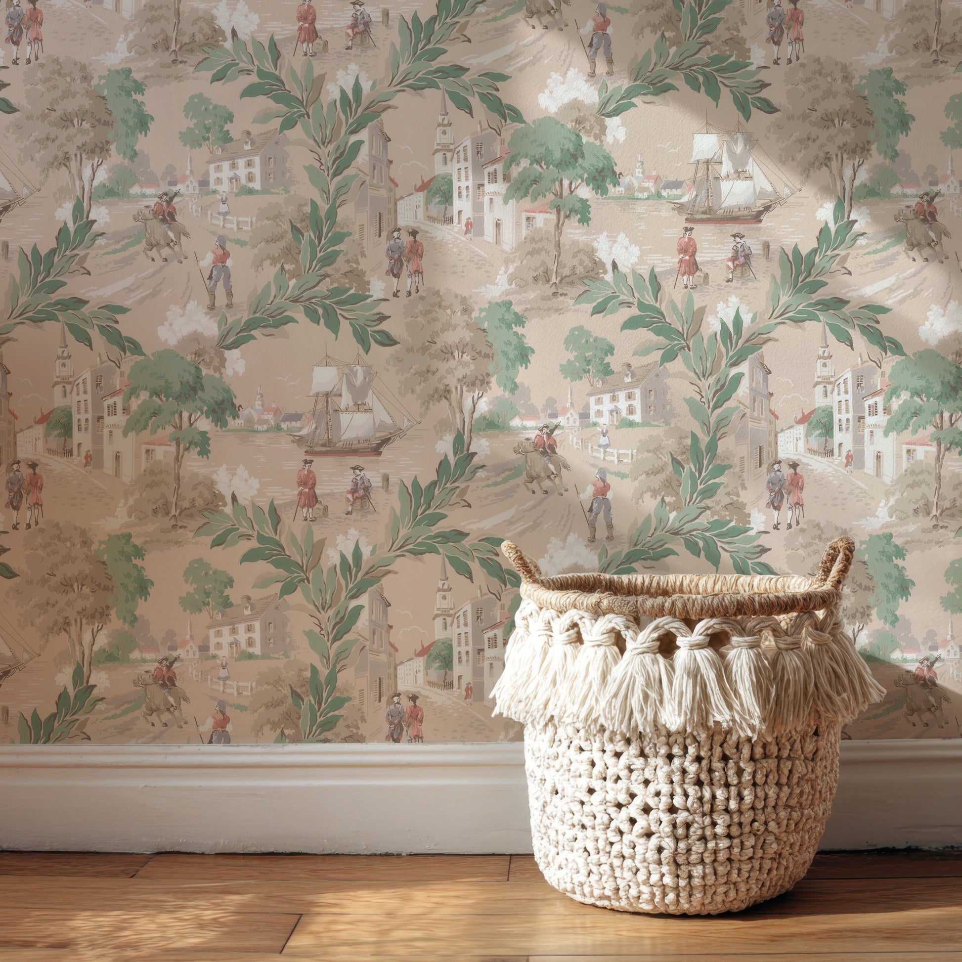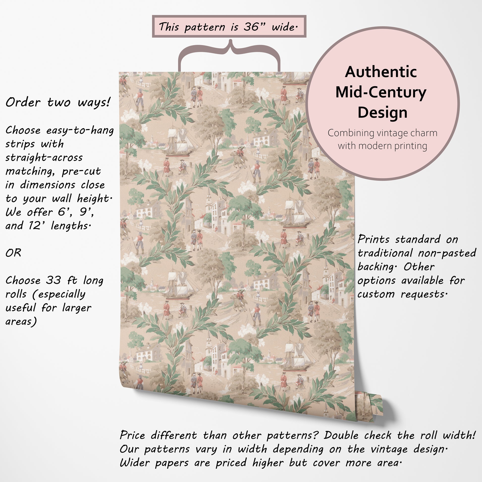This wallpaper is a reproduction of an authentic 1950s scenic design salvaged as part of the Hannah's Treasures Vintage Wallpaper collection.