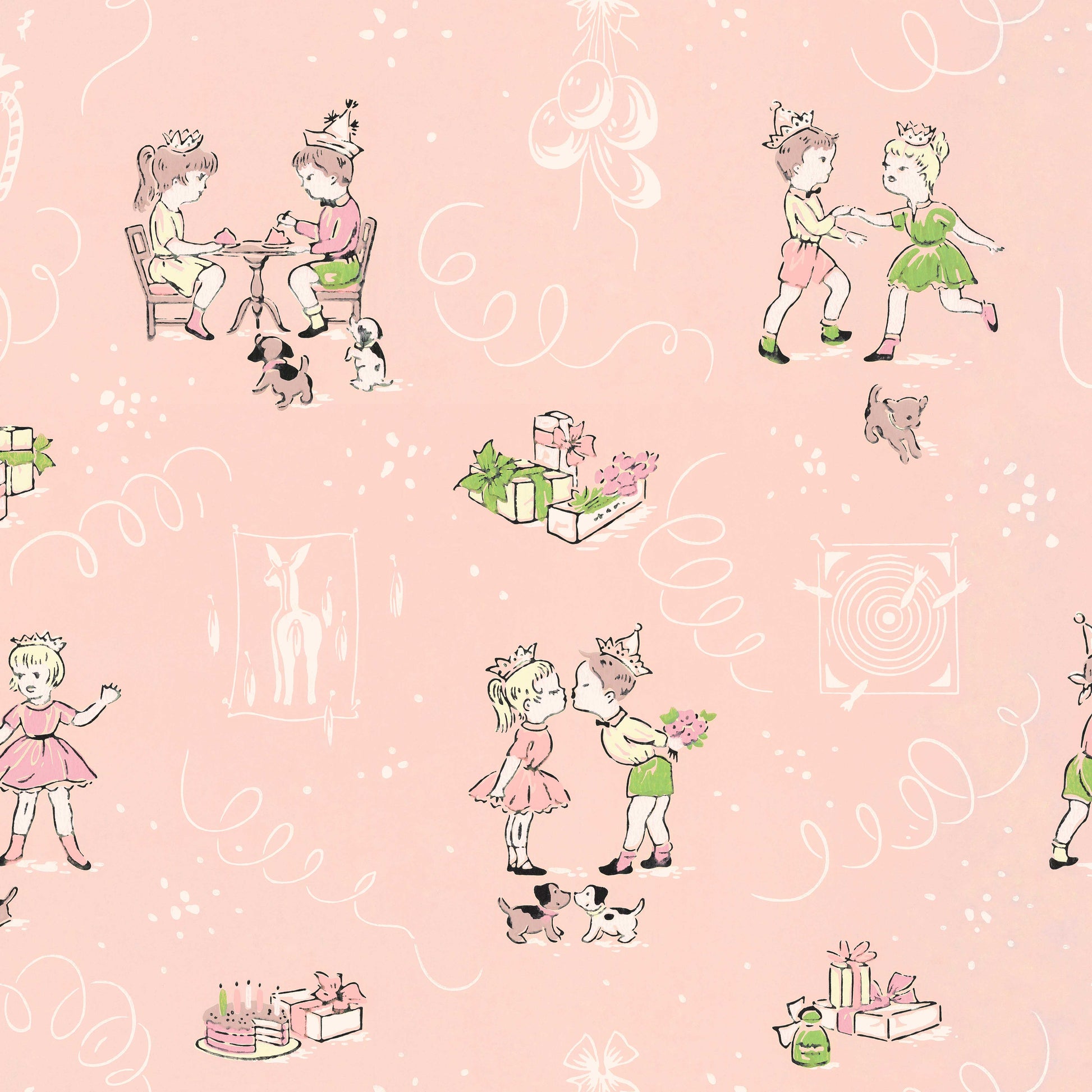 This wallpaper is a reproduction of an authentic 1950s childrens design salvaged as part of the Hannah's Treasures Vintage Wallpaper collection.