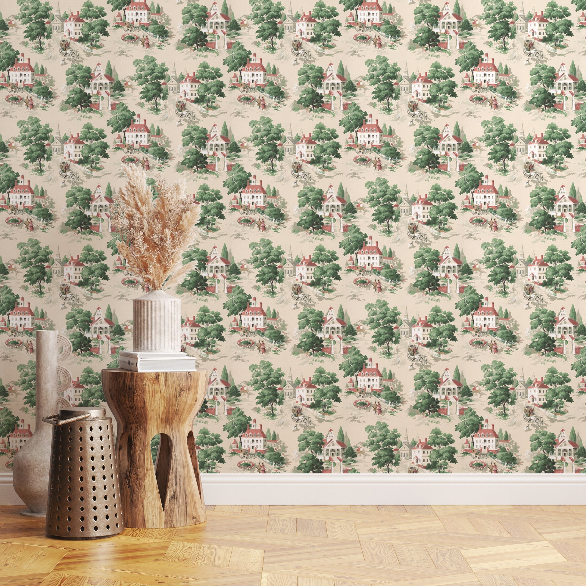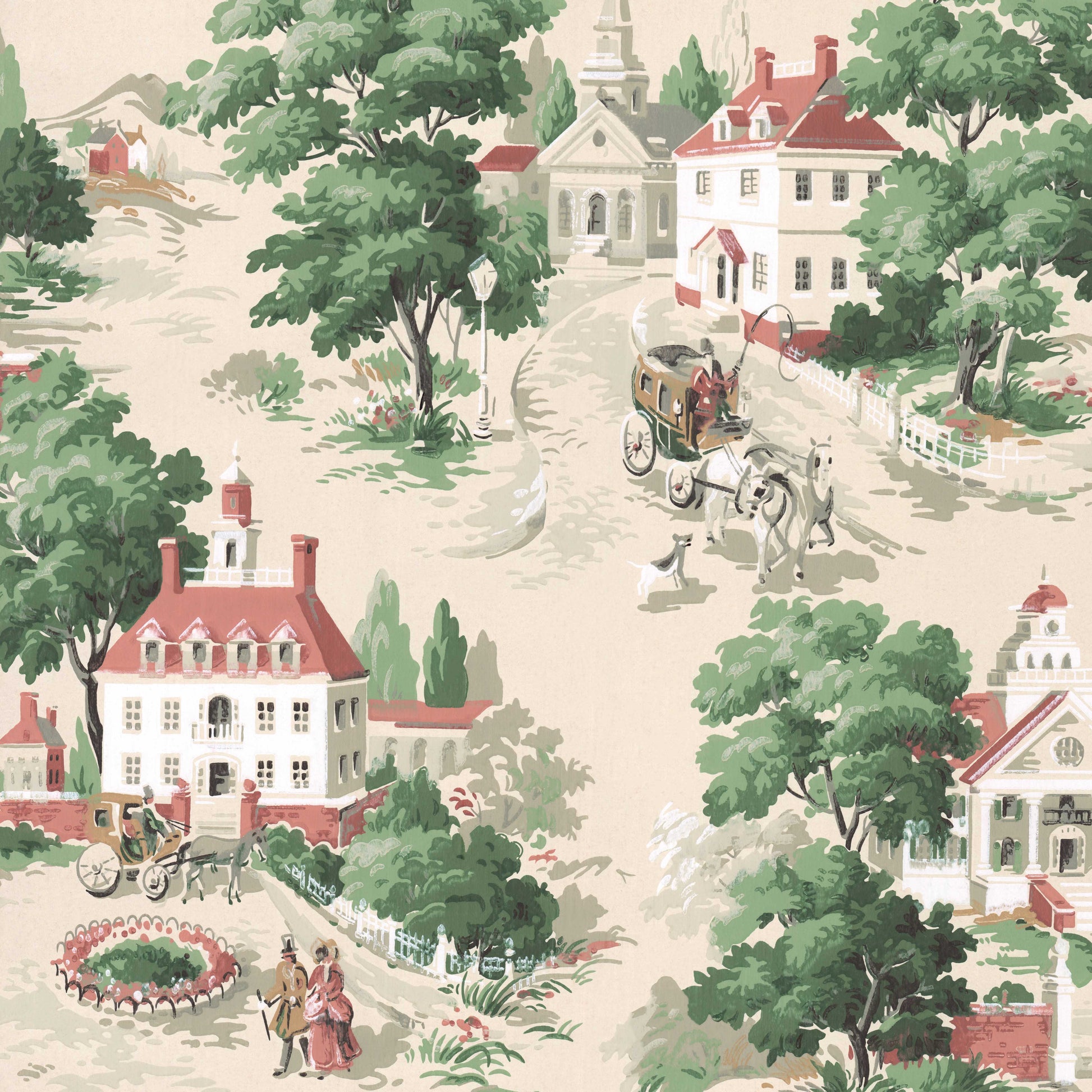 This wallpaper is a reproduction of an authentic 1940s scenic design salvaged as part of the Hannah's Treasures Vintage Wallpaper collection.