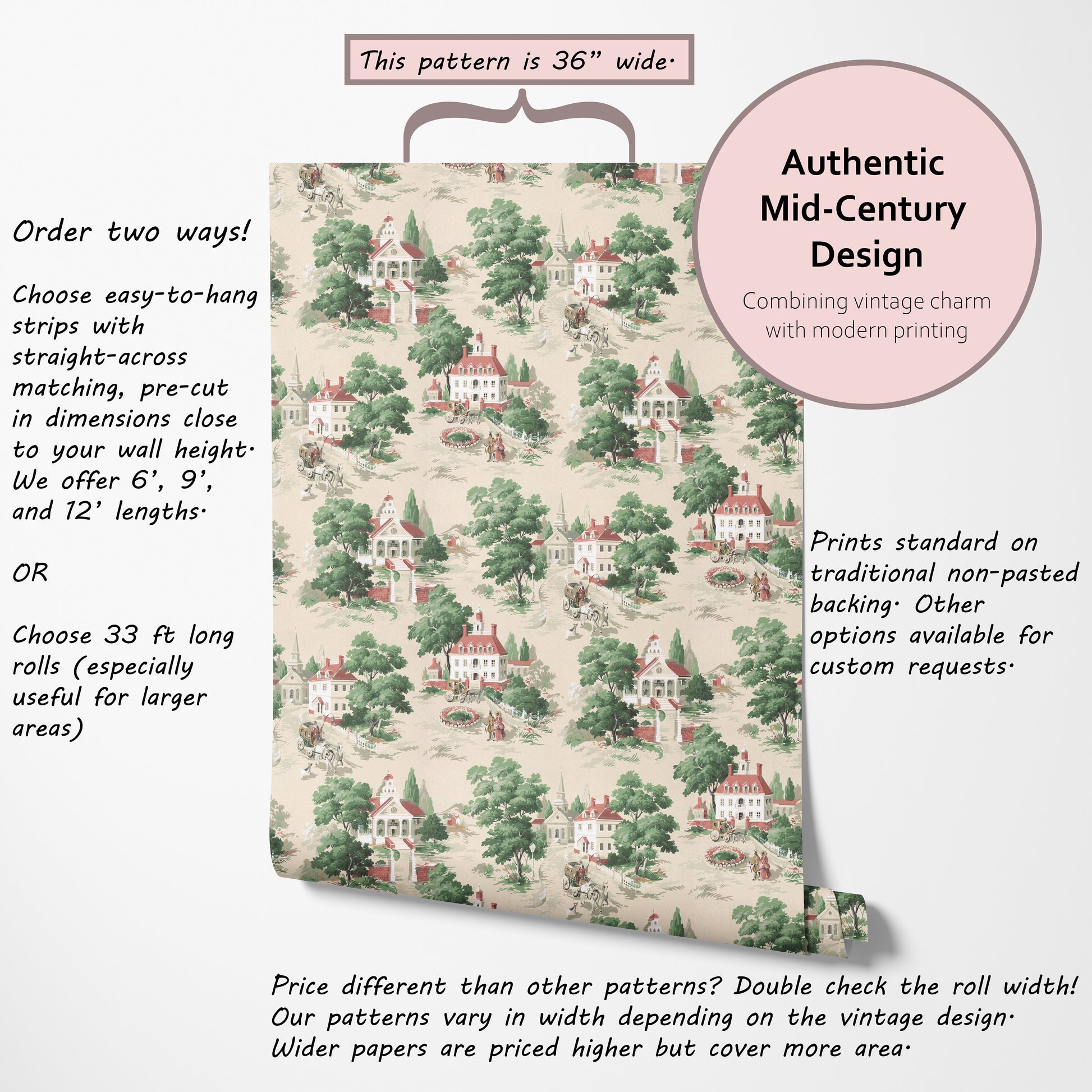 Our vintage wallpaper reproductions are printed to order and non-returnable.