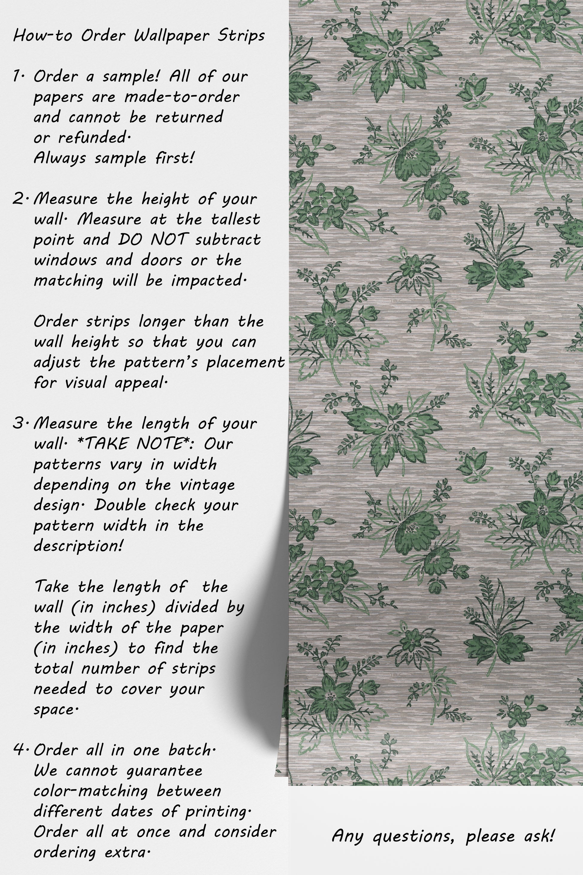 - Order a sample -- all of our wallpaper reproduction are made-to-order and cannot be returned or refunded. Always sample first!