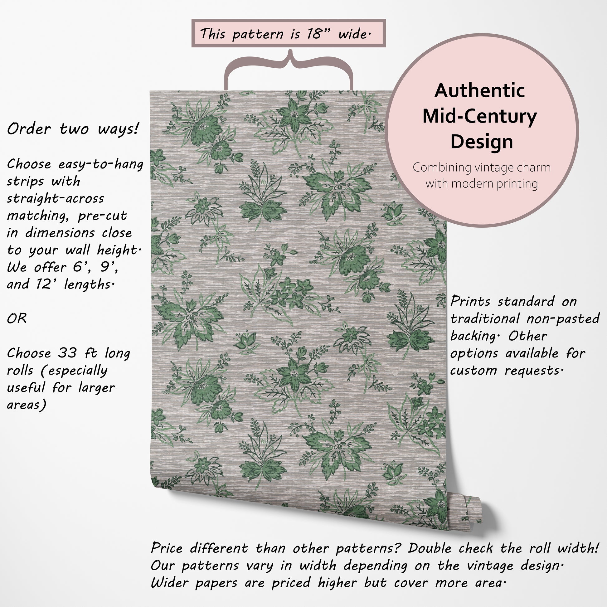 Our vintage wallpaper reproductions are printed to order and non-returnable.