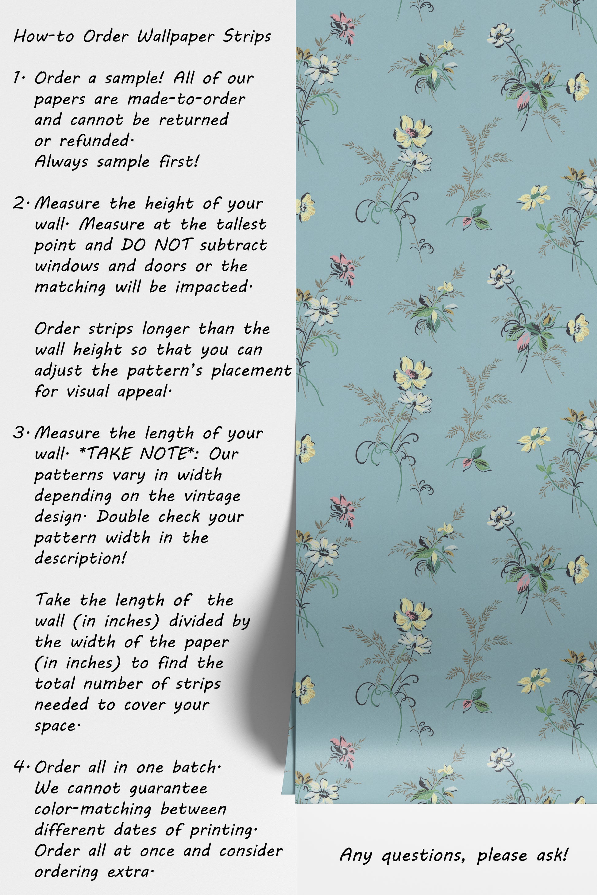 Our vintage wallpaper reproductions are printed to order and non-returnable.
