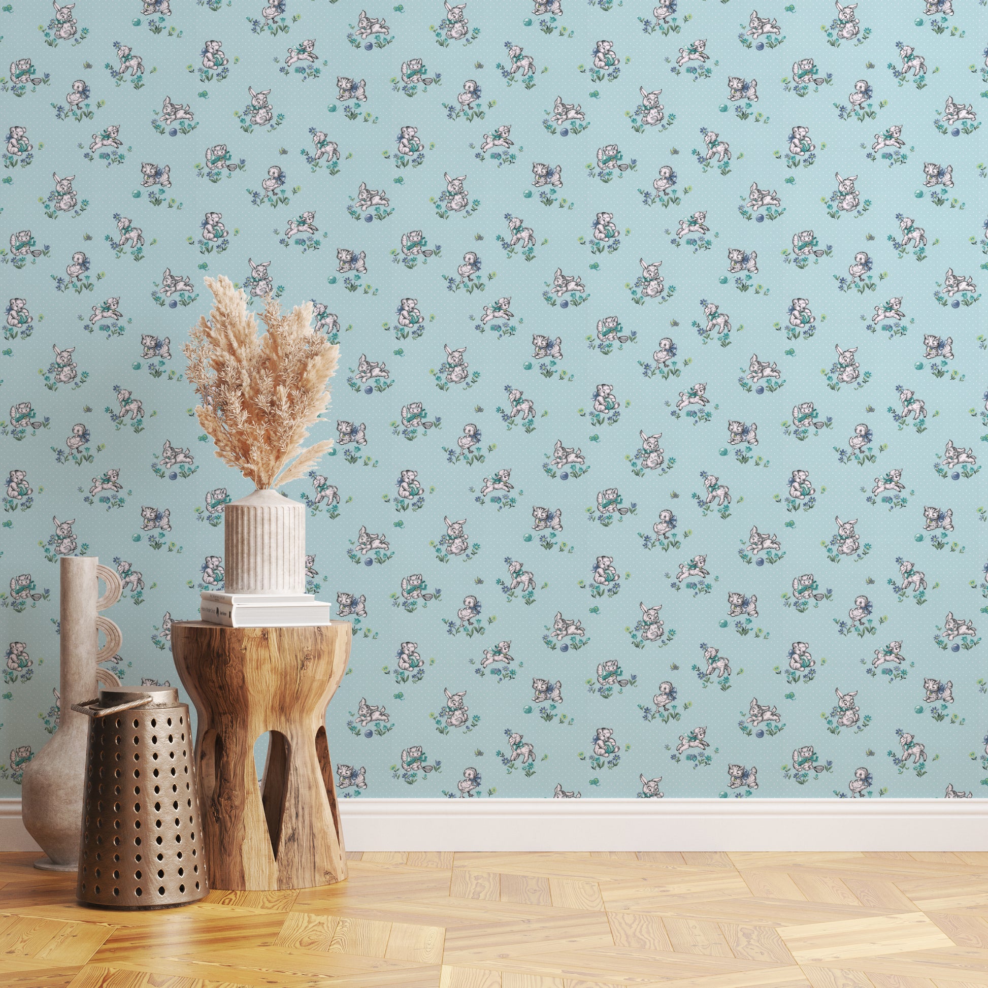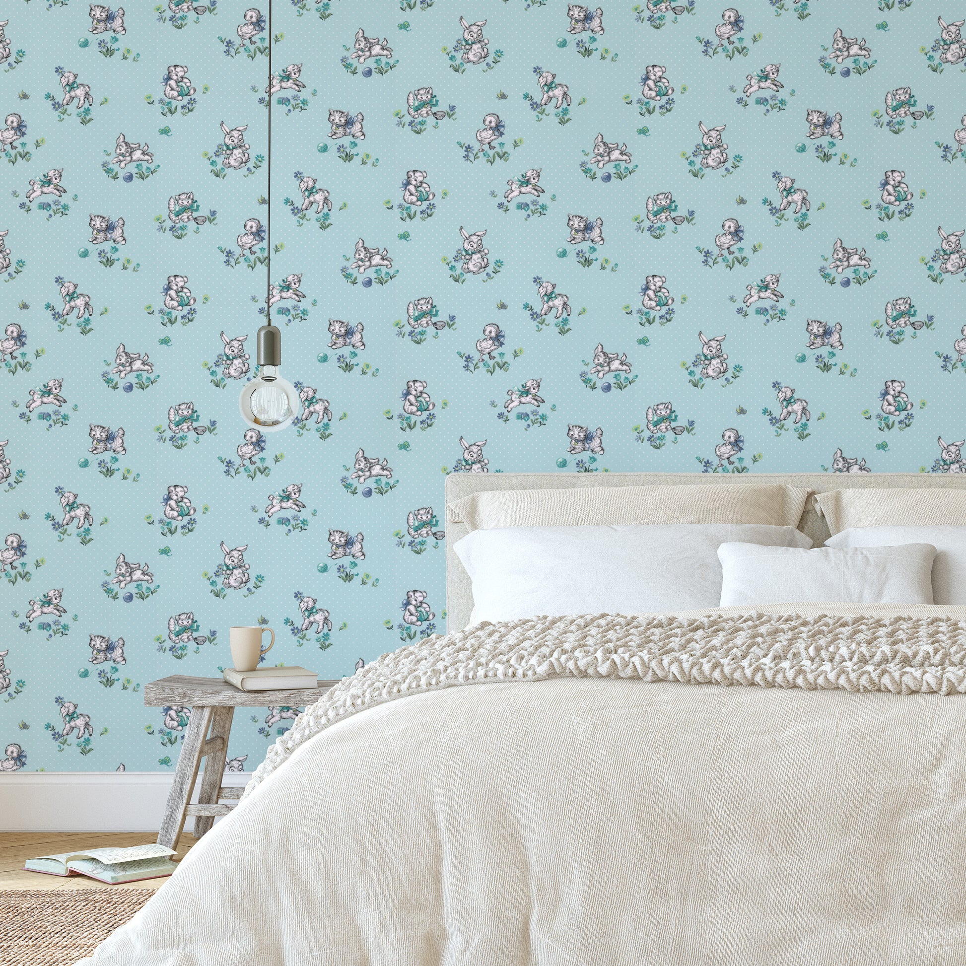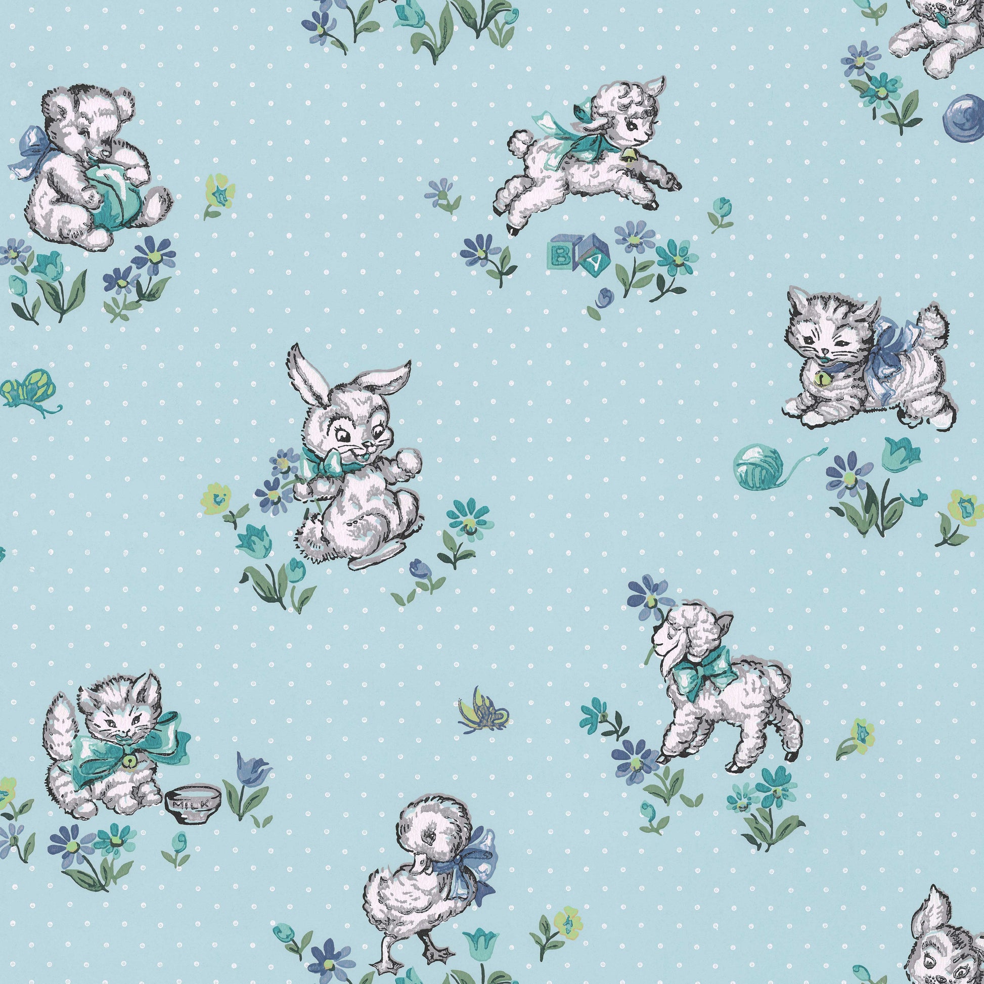 This wallpaper is a reproduction of an authentic 1940s children's design salvaged as part of the Hannah's Treasures Vintage Wallpaper collection.