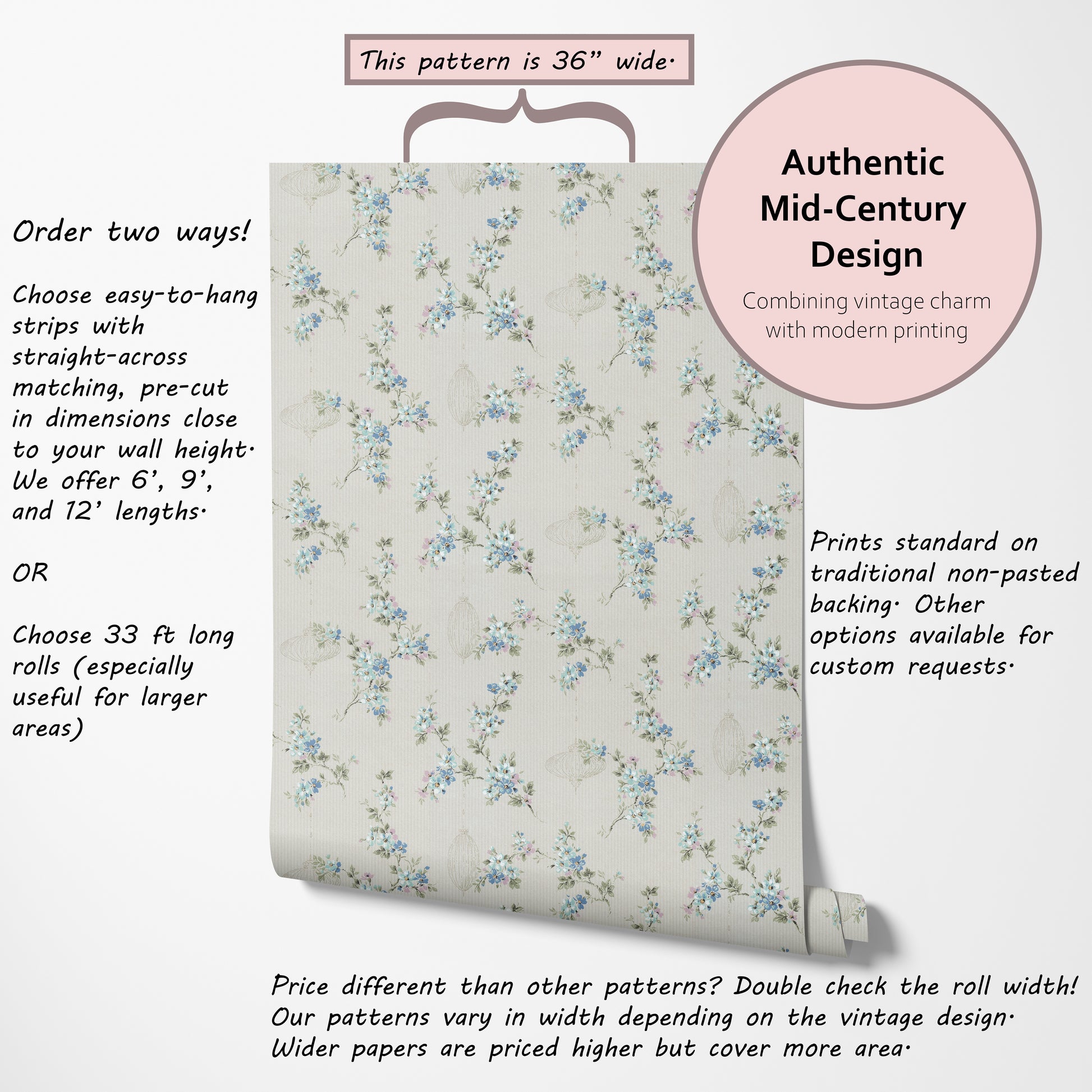 This wallpaper is a reproduction of an authentic 1950s floral design salvaged as part of the Hannah's Treasures Vintage Wallpaper collection.